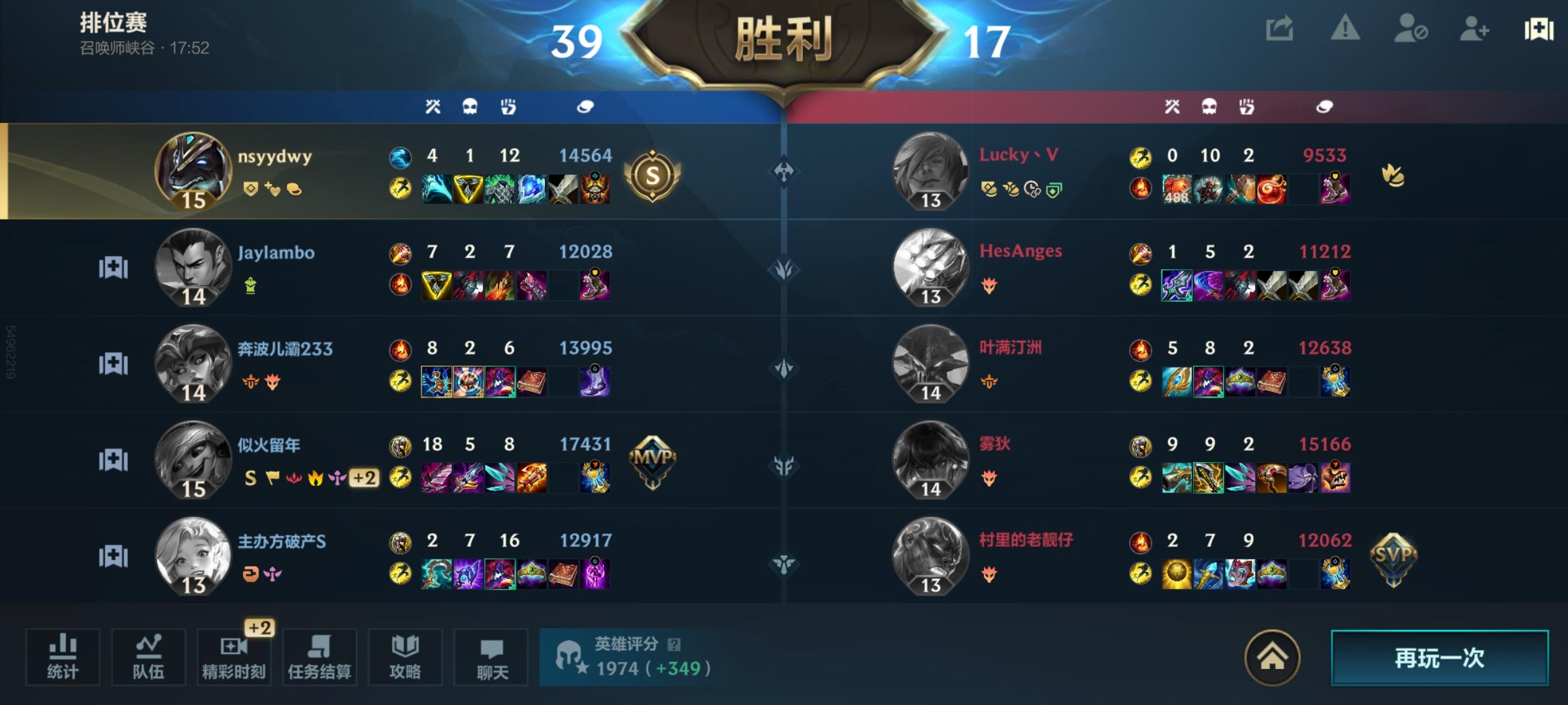 前几天刚卸载游戏,没想到立马下起了大雨,而且还一连下了好几天,于是百无聊赖的我(室外工作,下雨休息)又把lol下载回来了 然后用剑圣打野,继续连跪,从钻石掉到翡翠,后来又打上钻石,不过总体来说用剑圣很不稳定,抓人留不到人,经常是猥琐发育,团战等他们打起来再去收割,一旦团队中没有控制和坦克类英雄开团吸收伤害,进入战场很快就跪 后来试了几把阿木木,瞬间打开了新世界的大门! 刷野速度快,打龙、先锋速度也