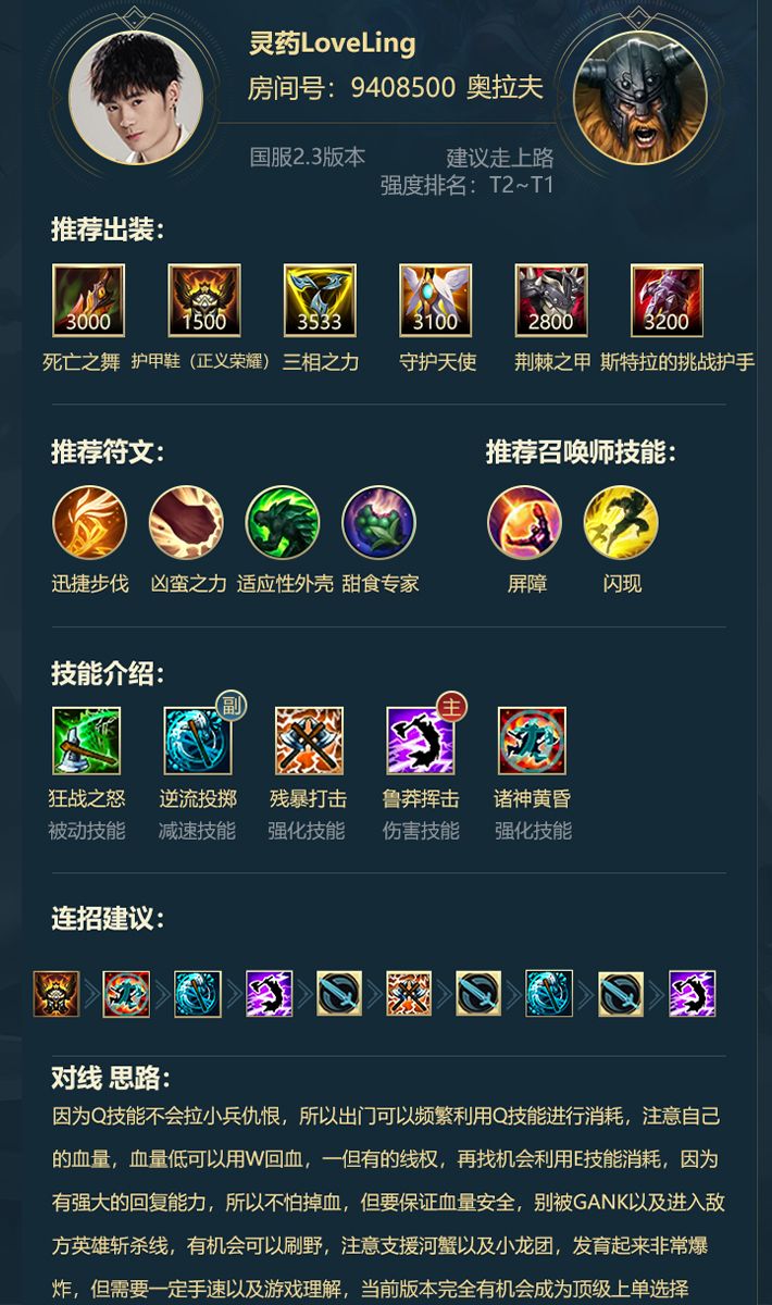 哈喽各位小伙伴,我是灵药LoveLing,LOL手游国服已经开始内测,在这里为大家献上LOL手游的全英雄攻略,本帖是上单篇。 欢迎各位小伙伴积极留言,同时也欢迎各位小伙伴到斗鱼9408500来看我的冲分直播,学技术来看我就对了! 话不多说,上干货! 奥拉夫: 盖伦: 嘉文四世: 贾克斯: 剑姬: 古拉加斯: 卡密尔: 黛安娜: 蒙多: 内瑟斯: 潘森: 墨菲特: 泰达米尔: 提莫: 辛吉德: 亚索