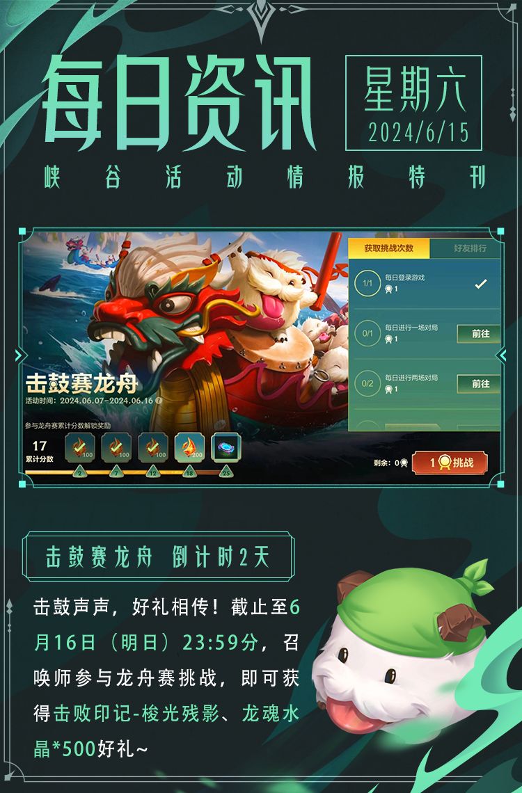 扭曲树精 茂凯现已正式上线峡谷,其伴生皮肤喵凯 茂凯首周更享超值优惠折扣,感兴趣的召唤师们千万不要错过哦~ 《英雄联盟手游》首个大熊猫知识公益科普计划将于6月20日正式开启! 全民电竞 获取冠军限定皮肤 全民电竞,兑换限定奖励!截止至7月31日23:59分,召唤师们完成电竞训练任务获得积分,即可抽取天赋觉醒系列皮肤、玉剑传说 苍鸾 莫甘娜、神龙守卫 加里奥、7天随机皮肤宝箱、双倍晶石卡以及龙魂水晶