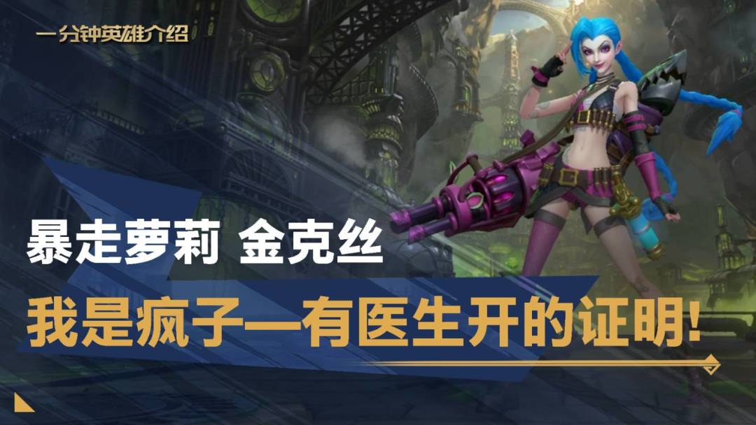 暴走萝莉金克丝,是一位擅长复杂战场收割残局的AD射手。两种武器的灵活切换和英雄被动攻速与移速的持续加成,让金克丝在后期的团战中来去自如。