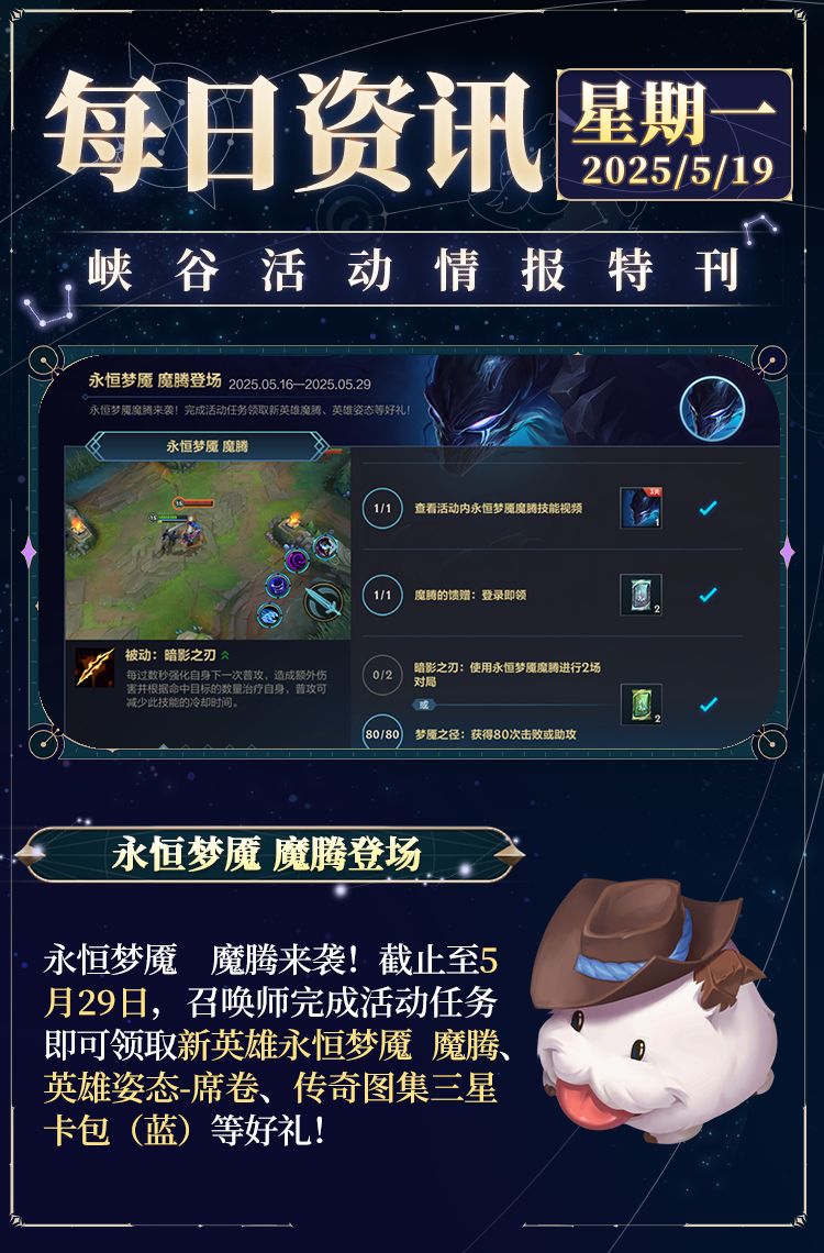 在欢乐之星照耀的峡谷里,却潜藏着一个黑影,它四处收割着孱弱的灵魂,无论逃至何处都将被它追杀,如今峡谷中每一片阴影都在低语这位恶魔的名字——永恒梦魇 魔腾! 在游戏中,魔腾是一位兼具爆发与收割能力的刺客英雄,他能无视地形直切后排,并利用视野压制敌人,为团队创造以多打少的机会~ 技能介绍 被动技能:暗影之刃 魔腾每过数秒就会强化自身下一次普攻,对目标及周围敌人造成额外伤害,并根据命中目标的数量治疗自身