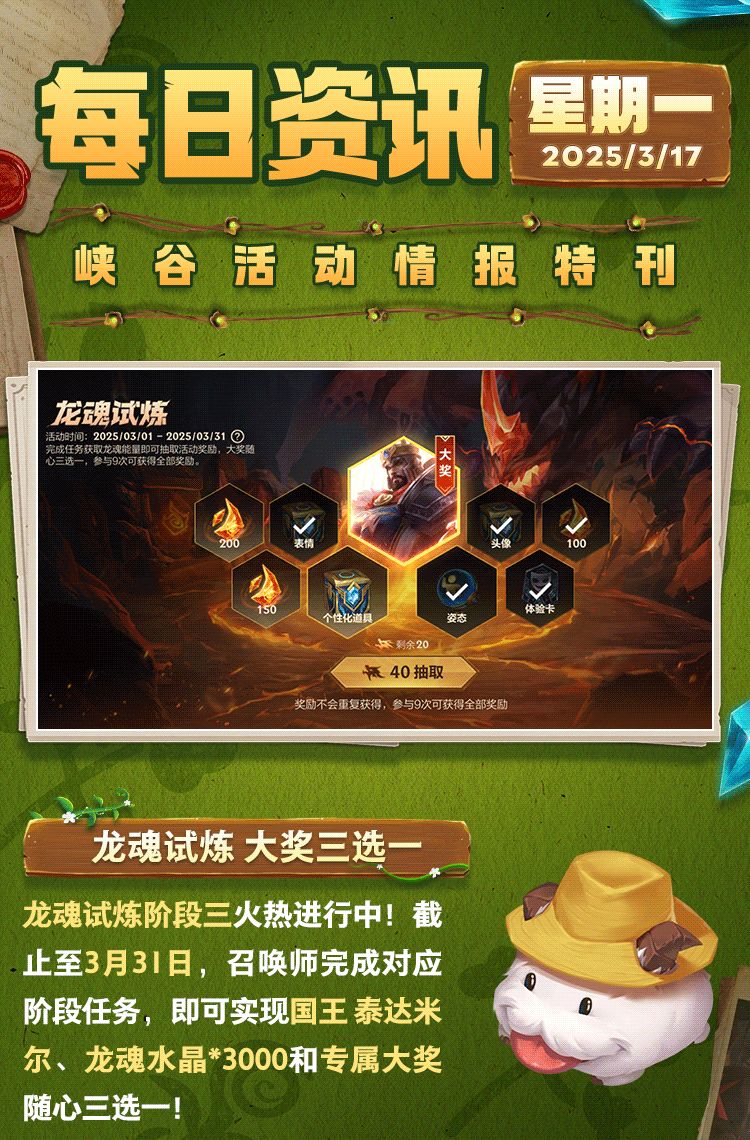 约德尔人进步会 波比悖论仍在继续,我们的调查取得了很多线索。你能破译其中的关联吗?3月28日,锁定约德尔人进步会,一起迎接波比的到来! 同游春日好时光 与好友共度峡谷欢乐时光!即日起,截止至3月31日,召唤师参与活动即可赢取龙魂水晶*1000及精选个性化道具随机宝箱好礼~ 此外,召唤师还可扫描下方二维码,下载登录《英雄联盟手游》电竞客户端,解锁更多福利好礼! (电竞客户端目前仅对安卓用户开放) -