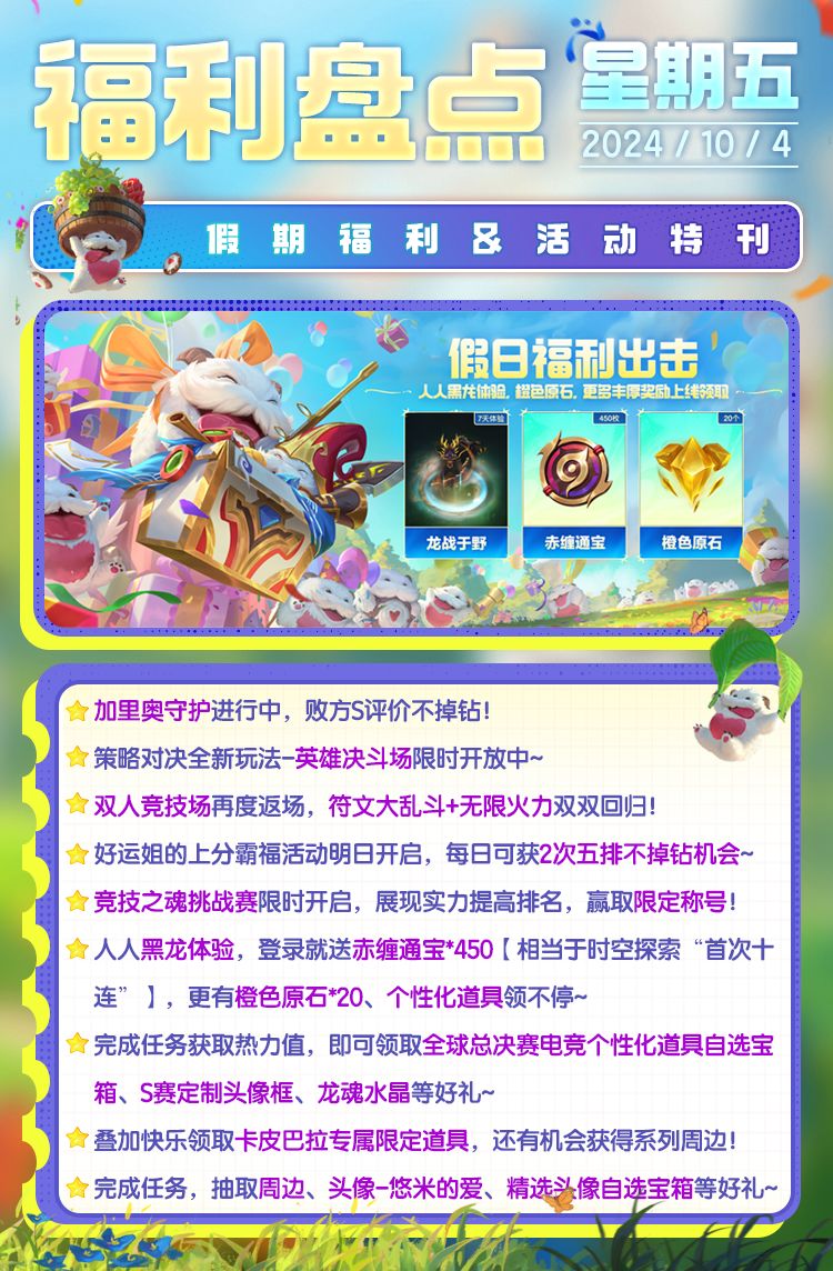 领回去! 快领回去! 领什么?当然是把假期福利好礼通通带回家啦~假期已过半,福利不能断!召唤师们沉浸式享受假期,激情对决的同时,也别忘了领取各式丰厚奖励。 卡皮巴拉来了 和限定守护灵「花生」一起探索峡谷~截止至10月10日,召唤师可通过完成任务获得快乐值,使用快乐值叠加快乐,当叠加达到指定次数即可领取称号-情绪稳定、头像框-卡皮巴拉等好礼! 假日奇遇 畅享好礼 好友相聚,纵享好礼!截止至10月8日