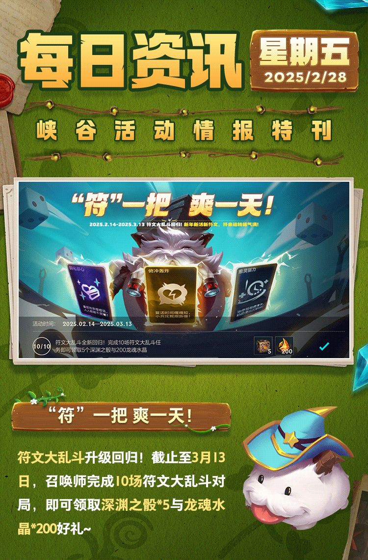 ☆ 符文大乱斗 每日一套路 ☆ 暴击溅射流 今日推荐 符文套路千千万, 跟着隆哥天天换~ 全新符文大乱斗“魔力汇流”版本来袭! 6大流派、40+全新符文组团出道~ 流派随心选,套路随性玩, 符文乐趣劲爽不停,峡谷战场由你主宰! 为了让每位召唤师都体验到不同符文的快乐,隆哥会每天为大家带来“符文大乱斗套路推荐”,同时也欢迎大家在评论区,分享交流爱用/好用的符文玩法呀~ 暴击溅射流 觉得对面前排像一堵