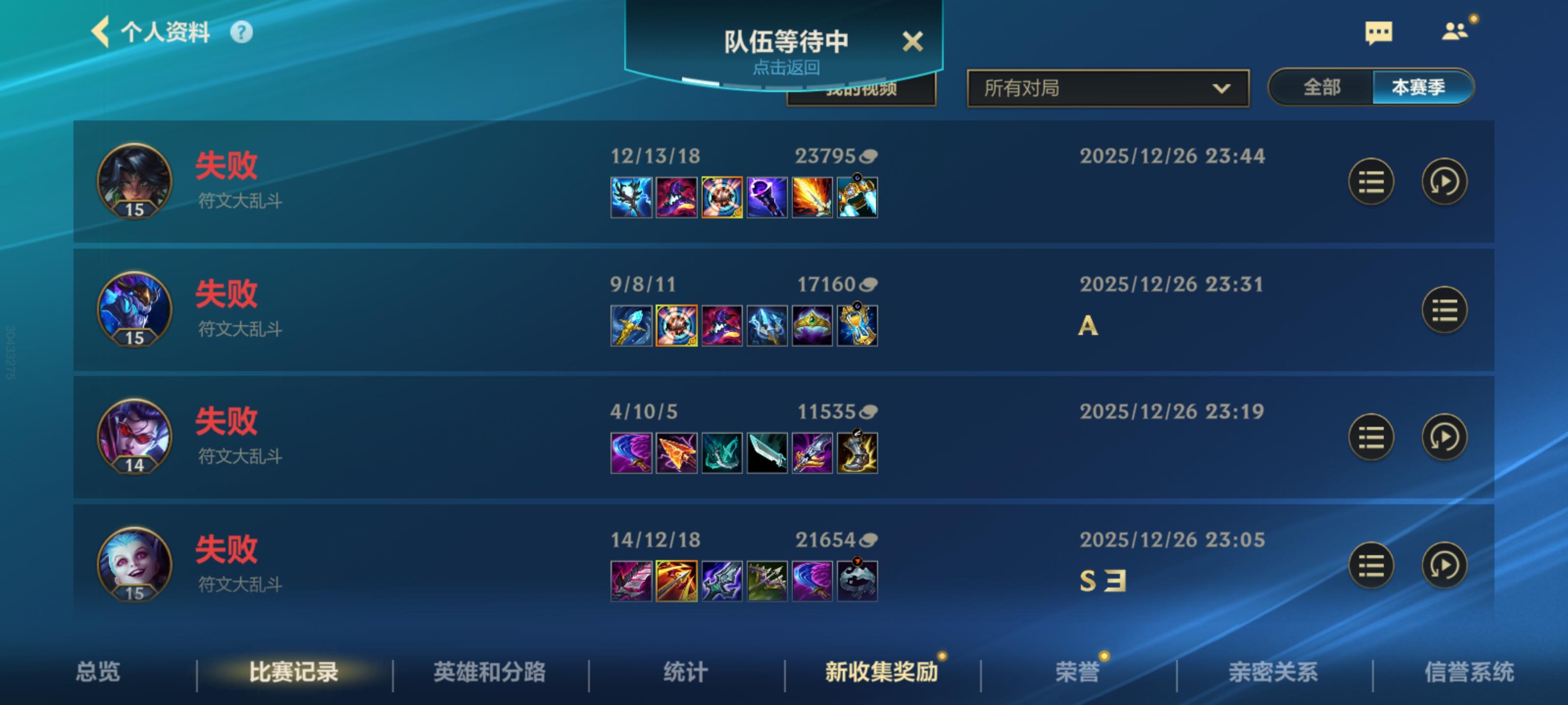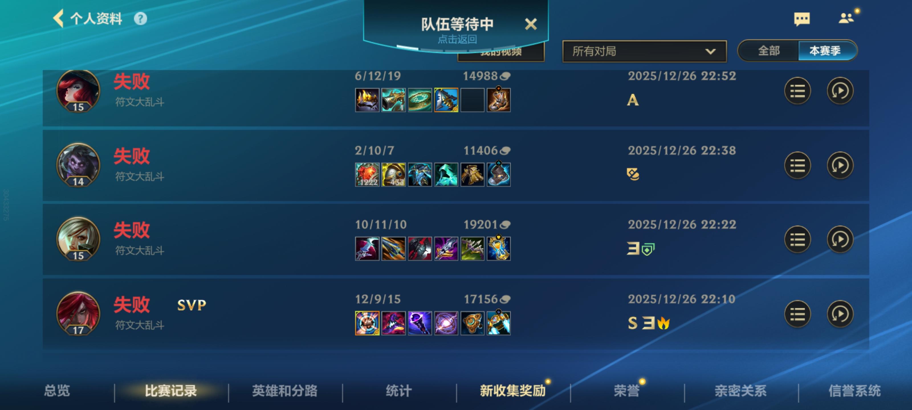 纯单排。很多次想放弃,想着混个宗师30星就行了。2025.11.02日 大师1星。52场71%胜率。2025.11.27日 宗师30星。167场56%胜率。2025.12.25日 王者60星。247场57%胜率。只玩上路,补位过辅助(大约10场)。上路主玩:纳尔、天使、狼母、永恩、剑姬、蛮王、盖伦。(根据场次排序)BAN 莫德凯撒(铁皮数值怪!)、诺手(个人纯不想对线诺手)、蛮王(恶心