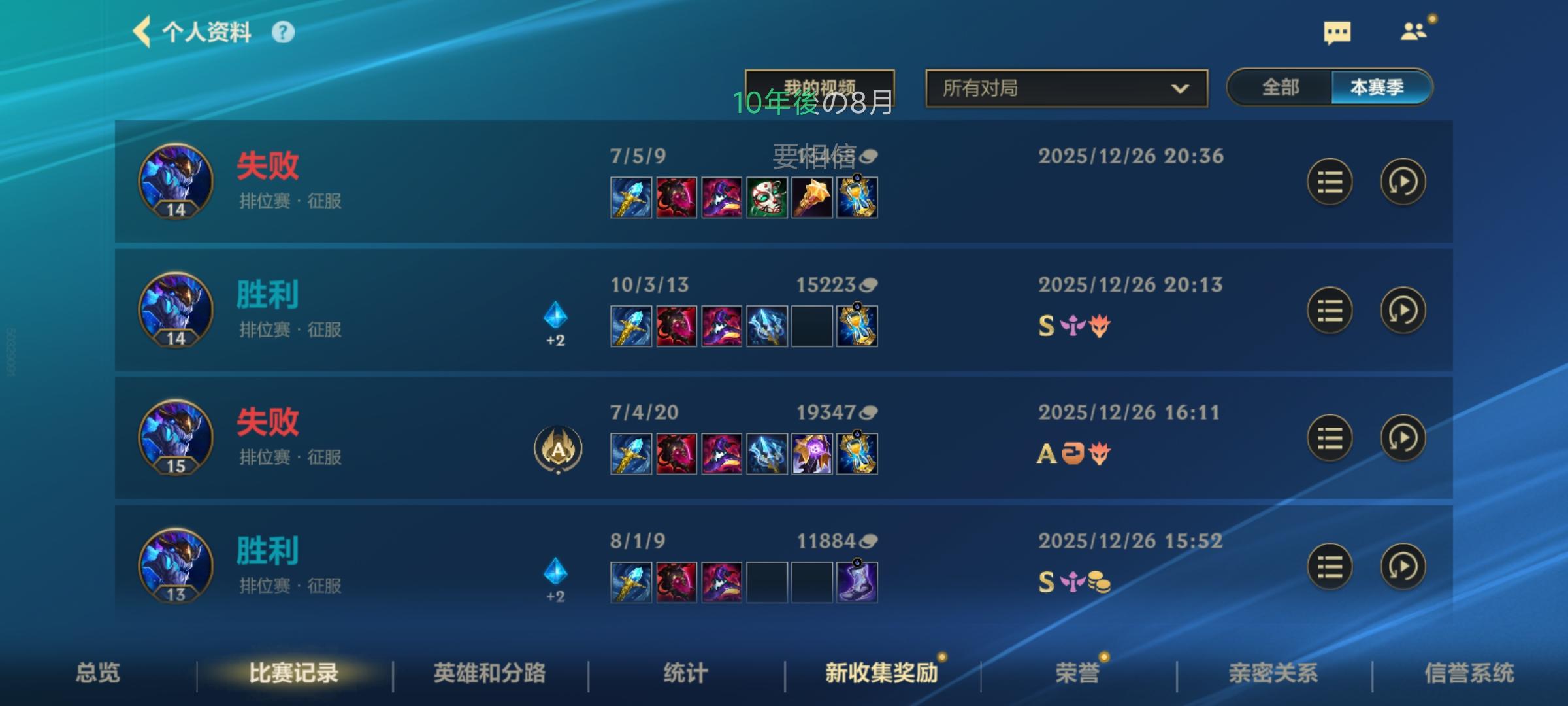 纯单排。很多次想放弃,想着混个宗师30星就行了。2025.11.02日 大师1星。52场71%胜率。2025.11.27日 宗师30星。167场56%胜率。2025.12.25日 王者60星。247场57%胜率。只玩上路,补位过辅助(大约10场)。上路主玩:纳尔、天使、狼母、永恩、剑姬、蛮王、盖伦。(根据场次排序)BAN 莫德凯撒(铁皮数值怪!)、诺手(个人纯不想对线诺手)、蛮王(恶心