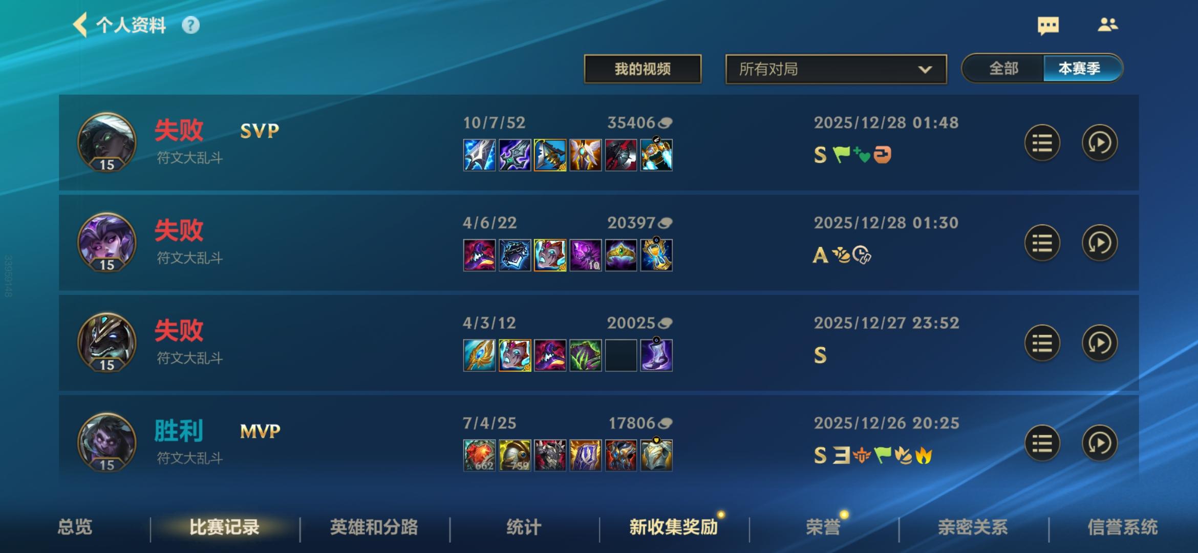 纯单排。很多次想放弃,想着混个宗师30星就行了。2025.11.02日 大师1星。52场71%胜率。2025.11.27日 宗师30星。167场56%胜率。2025.12.25日 王者60星。247场57%胜率。只玩上路,补位过辅助(大约10场)。上路主玩:纳尔、天使、狼母、永恩、剑姬、蛮王、盖伦。(根据场次排序)BAN 莫德凯撒(铁皮数值怪!)、诺手(个人纯不想对线诺手)、蛮王(恶心
