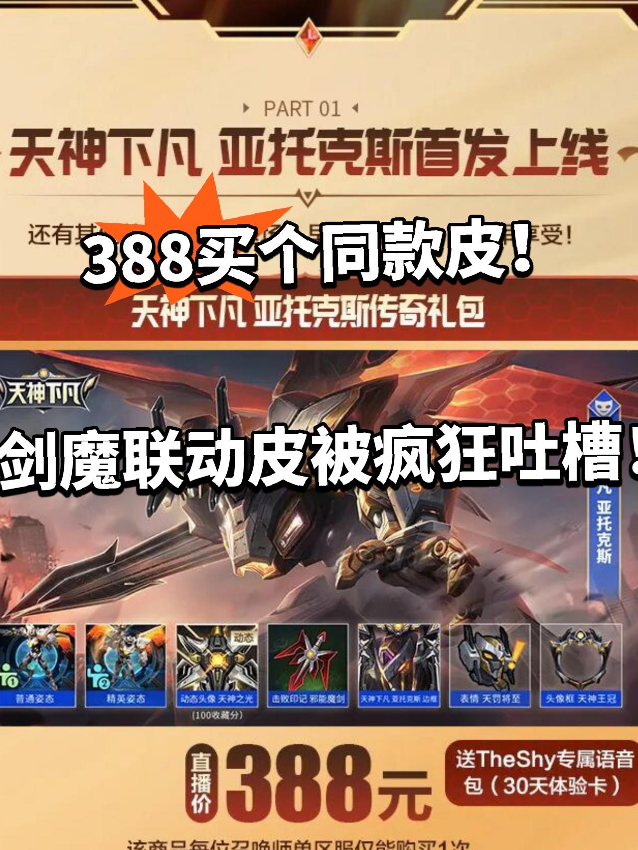 大的来了家人们!近日英雄联盟手游The shy剑魔联名皮肤正式上架了 结果却因为特效问题爆雷,被疯狂吐槽! 新皮肤叫“天神下凡”,本来是奔着The shy的传奇名场面做的,结果槽点一堆。最让人不满的是明明和霸天剑魔技能特效以及样式一样。相当于炫彩就卖388块 跟之前的霸天pro版本没多大区别,特效做得特别敷衍,完全没看出用心。 最搞笑的是开大的时候,可能会触发专属语音喊一句“天神下凡”。玩
