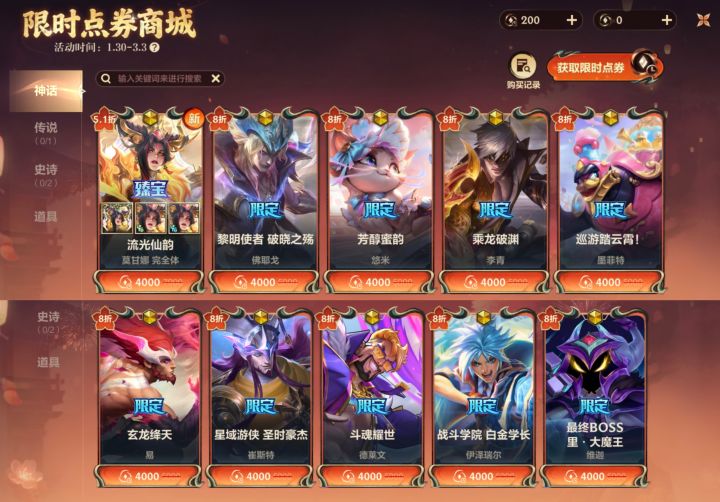🤣看到最新官方消息丸几立马开启🔛新的一篇详细介绍!(❗⚠️敲重点❗春节活动是1月30日1月30日开启!3月3日3月3日结束!不要漏看哇!)❗⚠️可以确认拿到:1️⃣自选神话皮肤+1️⃣自选传说皮肤+2️⃣自选史诗皮肤+1️⃣人马皮肤(7️⃣炫彩皮肤)+1️⃣随机史诗皮肤+1️⃣随机皮肤🥺详细介绍如下:💜图1️⃣~图2️⃣:限时点券商城的界面!有神话(10款选1),传说(