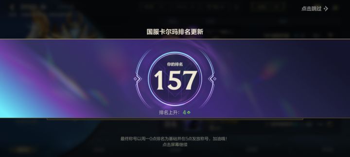 经过努力打日活,系统也是终于放过我了终于把峡谷之巅系数打上来了,这下可以拿下卡尔玛的国服了