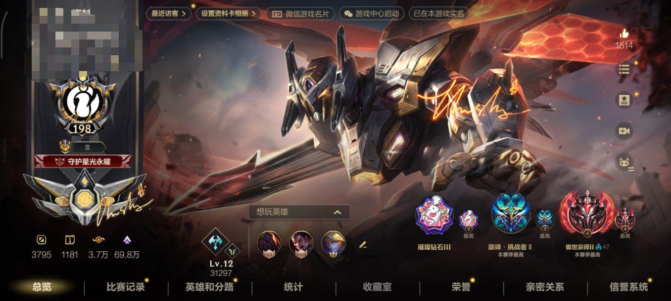 纯单排。很多次想放弃,想着混个宗师30星就行了。2025.11.02日 大师1星。52场71%胜率。2025.11.27日 宗师30星。167场56%胜率。2025.12.25日 王者60星。247场57%胜率。只玩上路,补位过辅助(大约10场)。上路主玩:纳尔、天使、狼母、永恩、剑姬、蛮王、盖伦。(根据场次排序)BAN 莫德凯撒(铁皮数值怪!)、诺手(个人纯不想对线诺手)、蛮王(恶心