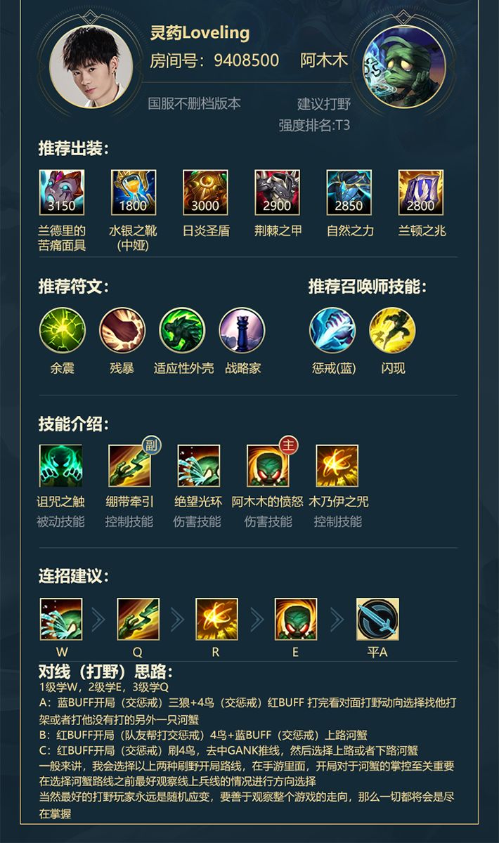 大家好,我是灵药LoveLing,英雄联盟手游国服不删档测试已经开服,在这里给大家分享一下我的英雄攻略,这篇是打野篇!
