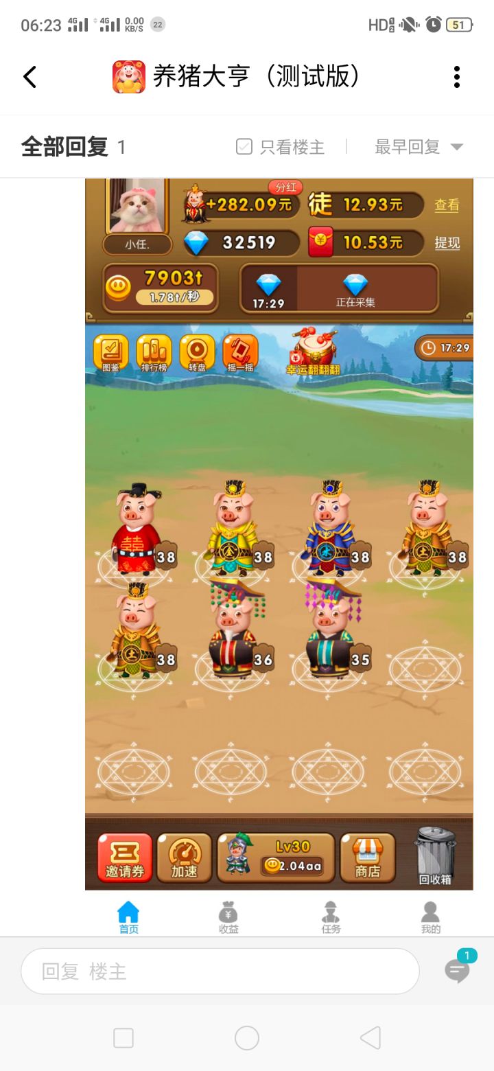 每天在这个上面花一个多小时,但只能合成两只37级,相当于每天只有一次合成分红猪机会,难度大,前期坚持20天左右到达37级,后期合成分红猪看运气。