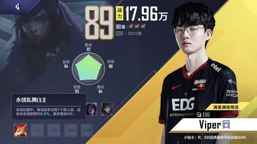 先看评分与技能 总结:冠军卡不出Bin哥战力最高 1.95的评分说明成长属性高,搞到满星几乎无敌 2.技能有点拉夸,上这张卡就一定要打上半区的优势,去搞到分推卡。不然就没什么用。 3.不好搭配,除非你本来就是用EDG卡组,很难与其他卡搭(不想拆队套的,而且1星冠军卡基本点等于2星还是3星的普通卡)性价比不高(氪佬除外) 4.回到1的几乎无敌,后期满星TheShy哥叠满buff对线上还是团战贡献都更