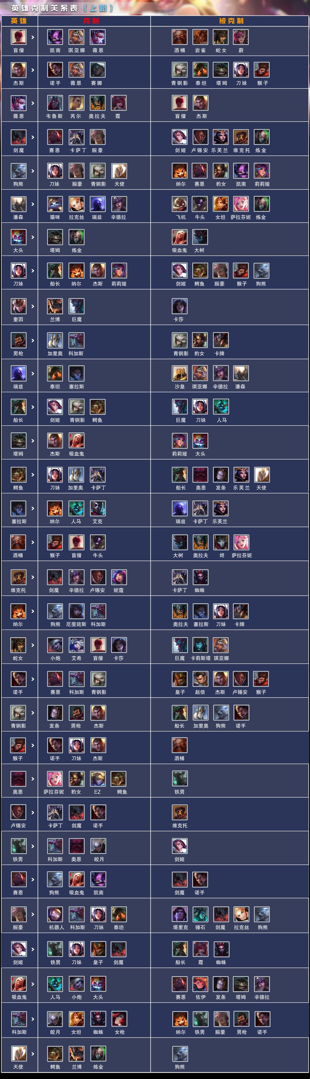 今天来给大家盘点一下比赛中各路英雄的克制关系,帮助大家能快速的了解游戏英雄BP机制,更加容易上手游戏~ 每个英雄都有他对应的counter位和被counter位,我们在BP阶段需要注意到这层羁绊,选取克制对面的英雄可以获得战力加成,能在战力相近的对局中先占上风~ 那么游戏中各路英雄的克制关系是什么样的呢?来,我已经给大家整理好了,往下看~ 这期先给大家展示上单之间的克制关系,后续会逐渐补全其他路,