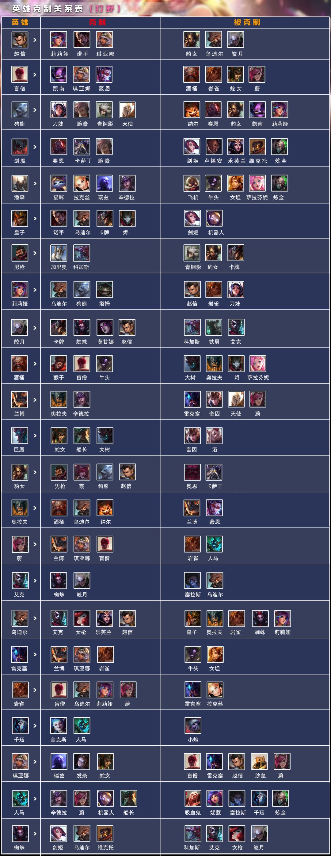 大家好,我来更新啦~今天给大家盘点的是比赛中各路英雄之间的克制关系——打野篇,希望能帮助大家能快速的了解游戏的BP机制,通向胜利之路,也方便不熟悉的新手经理们快速上手游戏~ 打野英雄在游戏中的克制关系已经整理好了,那么接下来一起看看吧,Let’s go! 本期带给大家的打野英雄克制关系就是这些,后续会慢慢更新完全部位置的,欢迎大家关注! 上期更新的上路篇及更多攻略戳我头像进主页了解~