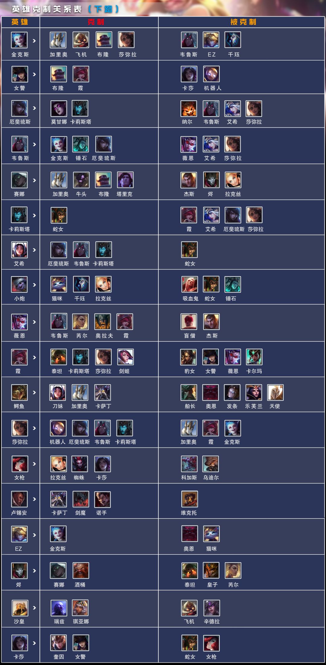 大家好,今天带来的是盘点比赛中各路英雄之间的克制关系——下路篇,也是最后一期啦~ 相信小伙伴们都明白BP的重要性了吧,不知道沫酱的整理是不是给大家带来帮助了呢?接下来送上下路英雄在游戏中的克制关系,大家收藏起来吧~ 英雄克制关系系列沫酱已经全部更新完毕,有需要的朋友们自取吧,感谢大家一直以来的支持! 上路篇、打野篇、中路篇、辅助篇及更多攻略戳我头像进主页了解~