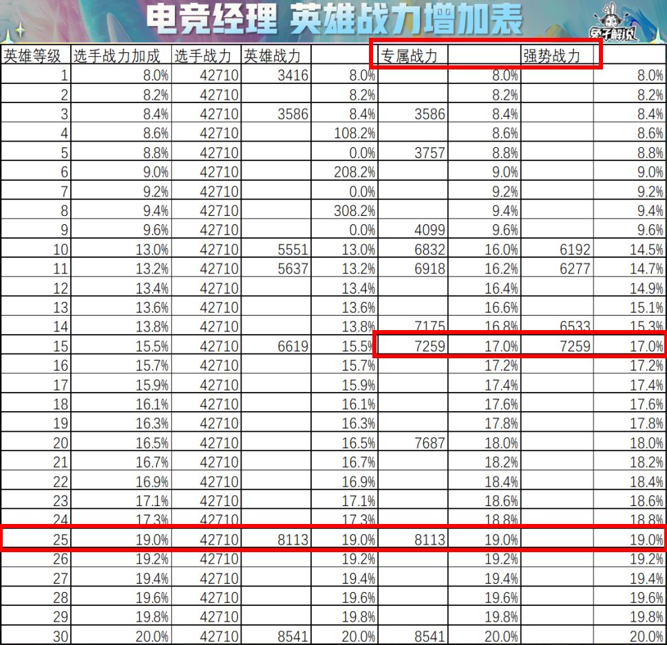 之前兔子给大家做过关键的英雄战力改动的一个分析但是很多人看了数据但是没有看懂这个数据的内核这个数据的关键点在于15级的时候专属战力和强势战力是一样的17%在25级的时候所有类型相等19% 如果有人记得兔子开服的时候做的强克联攻略的话就会对这个数字非常敏感那个时候因为专属增加27%战力所以专属大于一切但是现在改动之后就完全是按照强克联来去做BP了 你想想一个15级的专属加17%的战力一个强势的15级