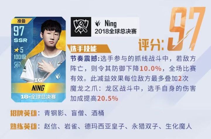 第一个技能是节奏震撼(注意技能是5星时候的属性,高星级数值会更高的)可以让对方全场一直减防,同时叠两次。这个技能比较适合抓下路,因为下路至少能击杀两个人,给多个选手挂山减防的效果。第二的技能是魔龙之爪,龙区团战增伤,这个也很强。因为游戏里大部分关键团战都是发生在龙坑的,相当于关键团都获得增伤总体来说,Ning这张卡五维很完美,没有明显短板,不仅能当功能型卡,也能当主C卡。目前打野位唯一冠军卡