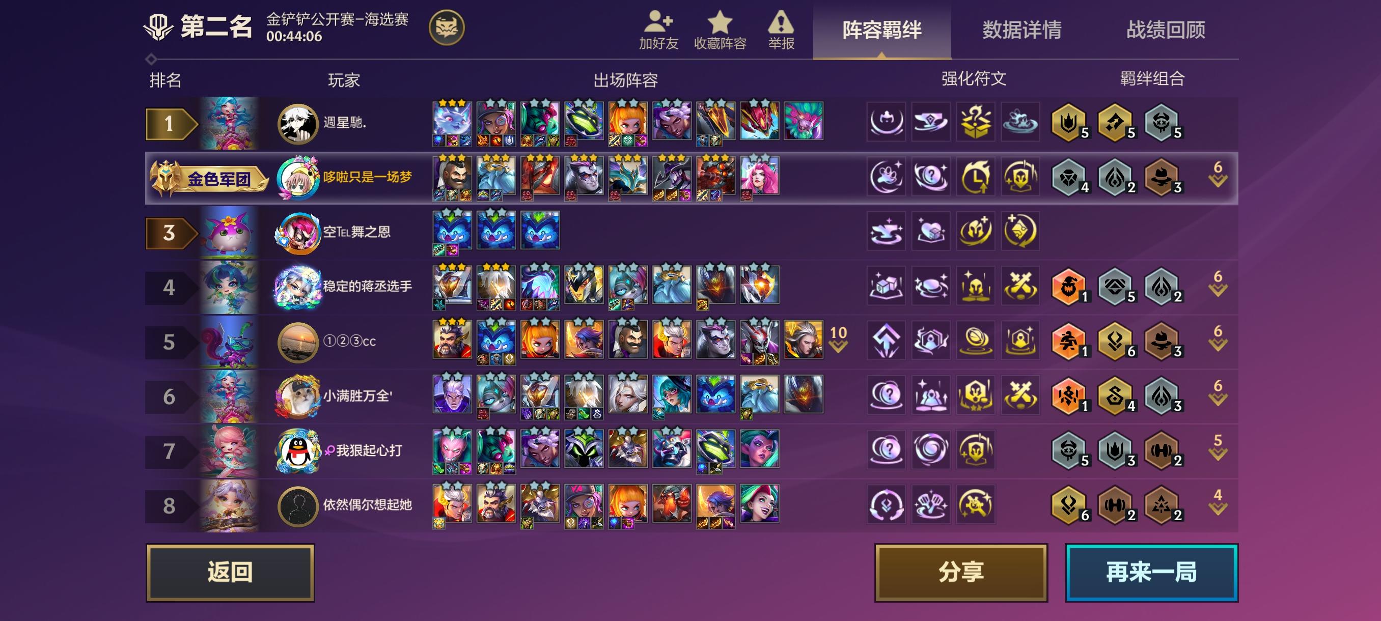 刀妹+洛+天龙羁绊的多重AOE 对面脆皮C位根本顶不住直接被秒 过渡思路 前期用剪纸搭配射手、斗士等过渡 优先做刀妹装备给希维尔过渡 再把肉装给到瑞雯打连胜 前中期把多补充阵容羁绊不D牌 有经济类海克斯可以拿一个快速上九 另外两个推荐战力海克斯进一步提高战力 中期灵活用高费的斗士、护卫棋子替换前排 正常3-2升六,3-6升七,4-2升八 八级后D到20金币左右,找二星的李青和加里奥以及卡莎就可以准