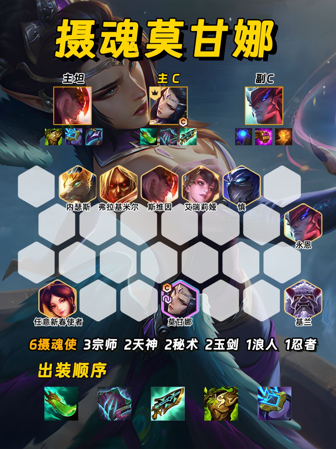 没玩过这个套路的兄弟姐妹赶紧试试🤣 摄魂莫甘娜真的是恶心膈应的很🤢 大范围伤害又能减攻击也就算了🙅♀ 放一个技能居然还能直接满血🩸 ✨过渡思路✨ 前期用强势天选凑羁绊过渡🚣♂ 猩红、决斗、天神等都可以✅ 八级钱根据来牌灵活选择打工棋子🃏 有合适装备直接合尽量打连胜🥇 4-2升八后直接梭哈找莫甘娜天选🧝♀ 然后就可以开始折磨对手了😛 眼看着对手即将切掉你的莫甘娜😰 一个技能瞬间回满血❗ 让对手