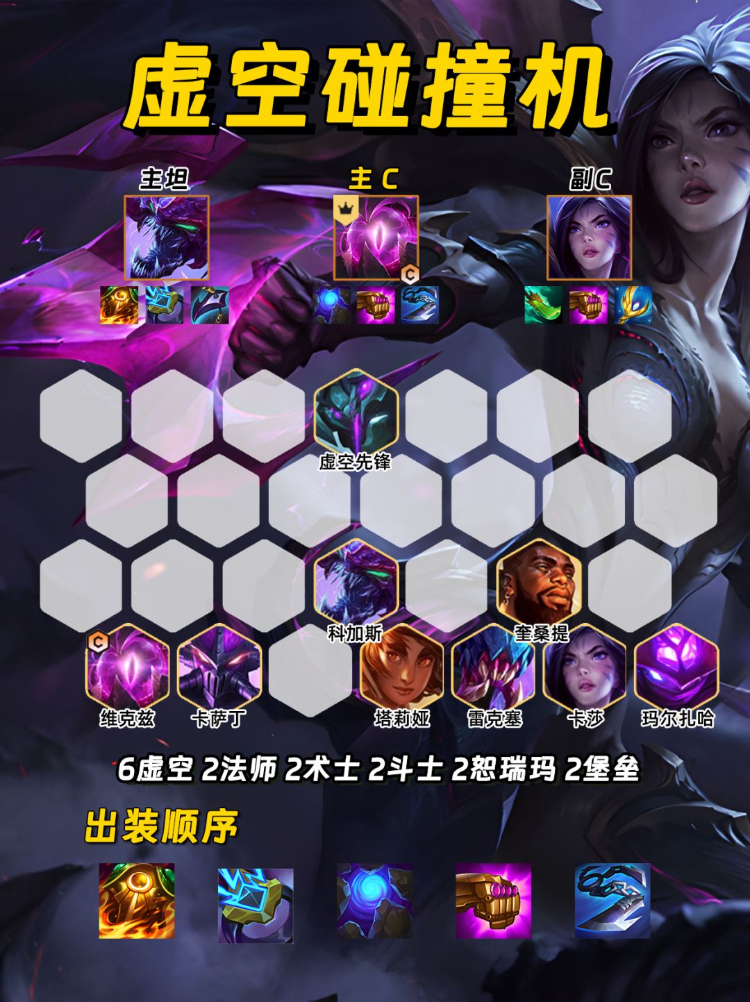 虚空这赛季很少有人玩🙅♀️ 这个套路就是专拿没人要的虚空棋子 无脑D出一堆三星即可坐等吃分💯 有一堆三星虚空棋子,虚空先锋👾真的巨肉 ✨过渡思路✨ 英雄之力选择李青🐲 前期正常升级用3虚空2法师过渡✔️ 五级卡50利息慢D大虫子和蚂蚱三星 三星后攒钱升级,六级不D牌❌ 4-2升七级,继续卡利息慢D大眼、卡萨丁、雷克塞三星 阵容就在七级一直D,一般不上八📈 来牌较胡上八之后可补奎桑提🏃♂️ 注意