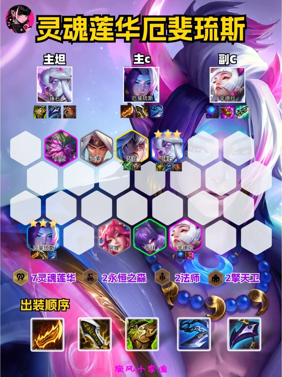 双头盔的出装思路真的很顶⛑ 每次只需要A一下就能释放技能 叠蝴蝶的速度简直不要太快🦋 ✨过渡思路✨ 前期用莲华搭配夜幽过渡🪷 装备给阿狸和诺手打工先 前期莲华可连接阿狸和亚索🌬 3-2升六优先开出5莲华 根据经济情况3-5或4-1升七📈 七级有辛德拉直接上场 4-2升八找到二星辛德拉⭐ 连接阿狸和辛德拉 锤石也尽量追出三星,然后即可升九🎃 九级补丽桑卓,有转职就给 把亚索替换成俄洛伊开四法师🧙♀