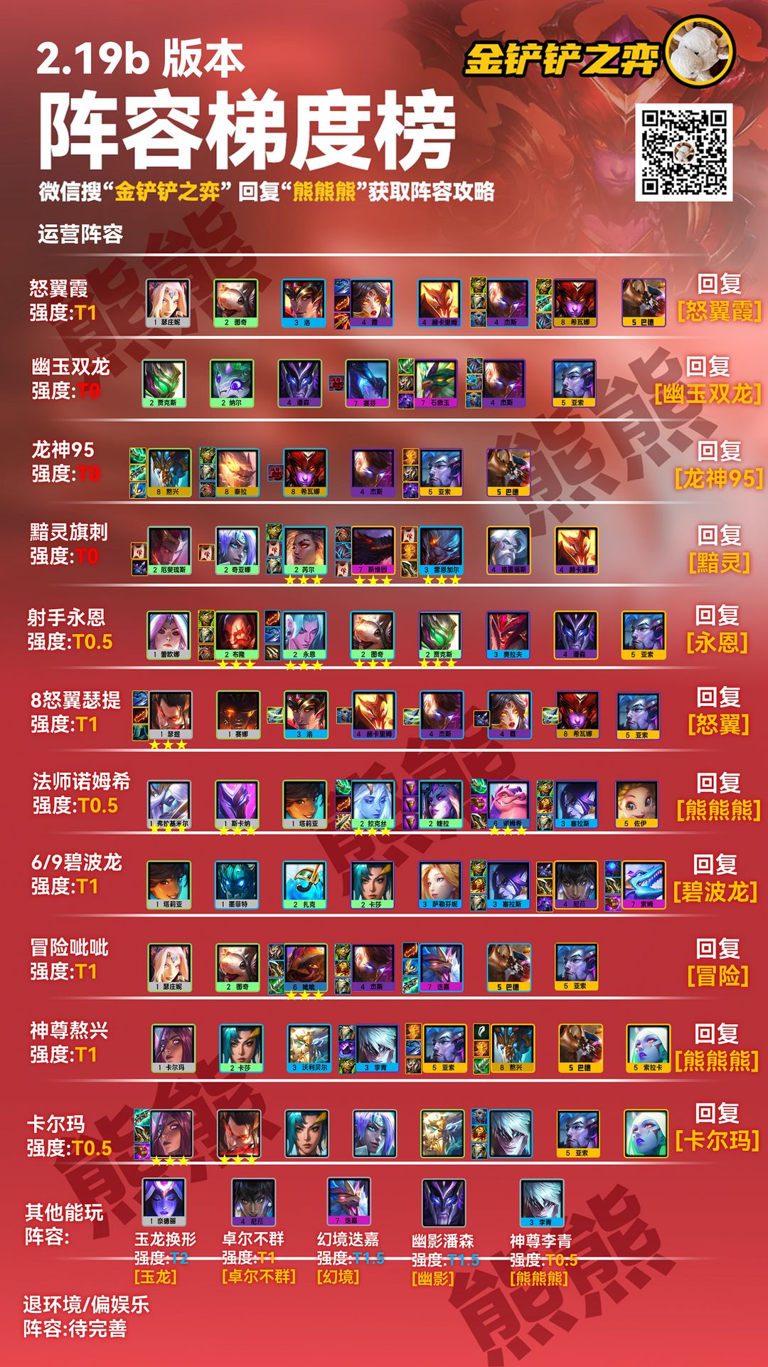 其实还有赌卡牌、赌老鼠、学院刺、赌船长、斗枪、女枪狙、赌狼人等一堆阵容,开服这会会陆续放出,可回复“T0”获取最新排行榜,回复对应【】内关键词可查询详细图文攻略 反问大家一个问题,如果挂件纯奔着剑姬、风女去搜牌,有多少时候因为1张搜不到而拉胯整个队伍,这个挂冰女狼人维克托的理解来自测试组杀生丸(国服外服双千分),且其他群友也实战测过这套改良配置,战绩1121。学院永恩的强度用我水友话说就是“大成9