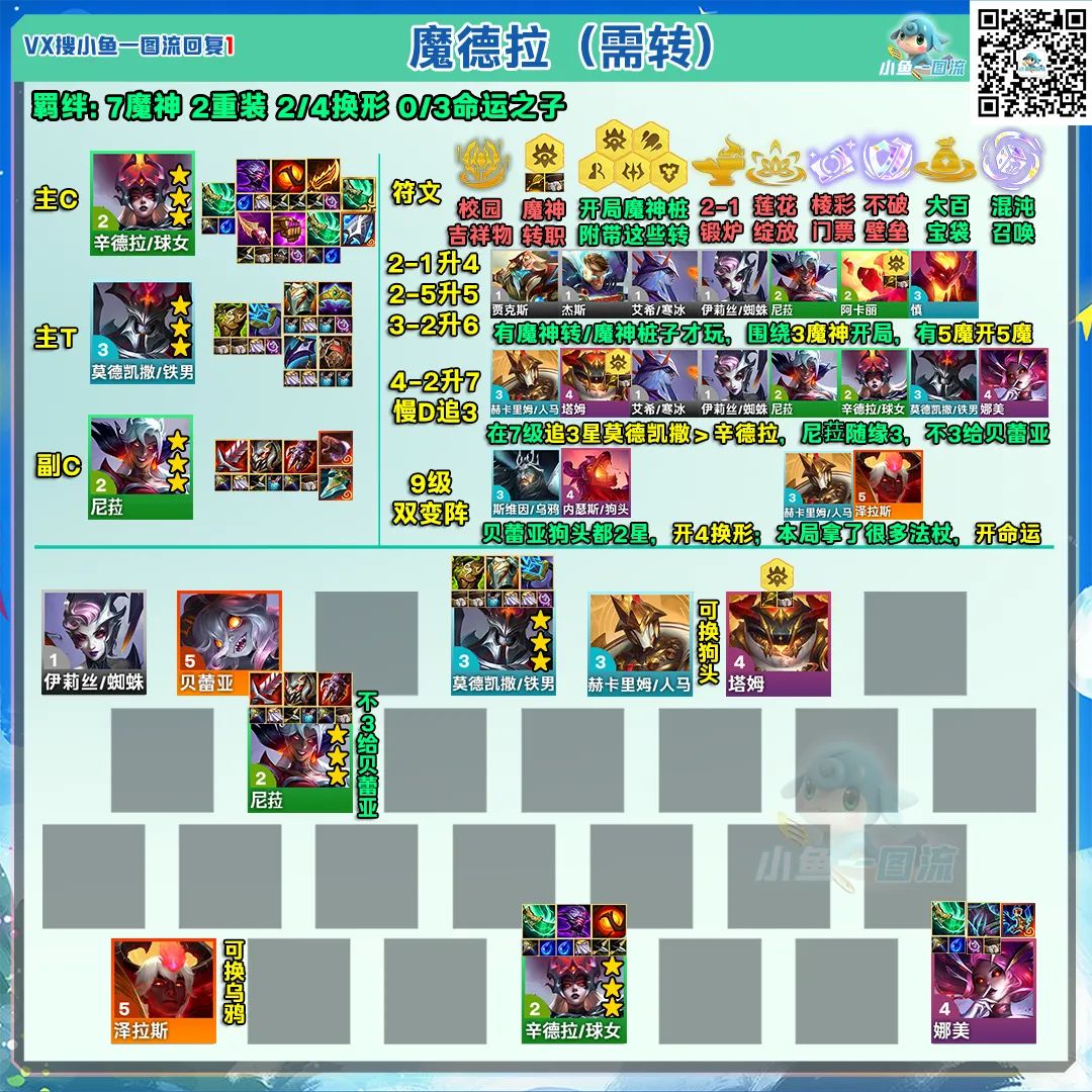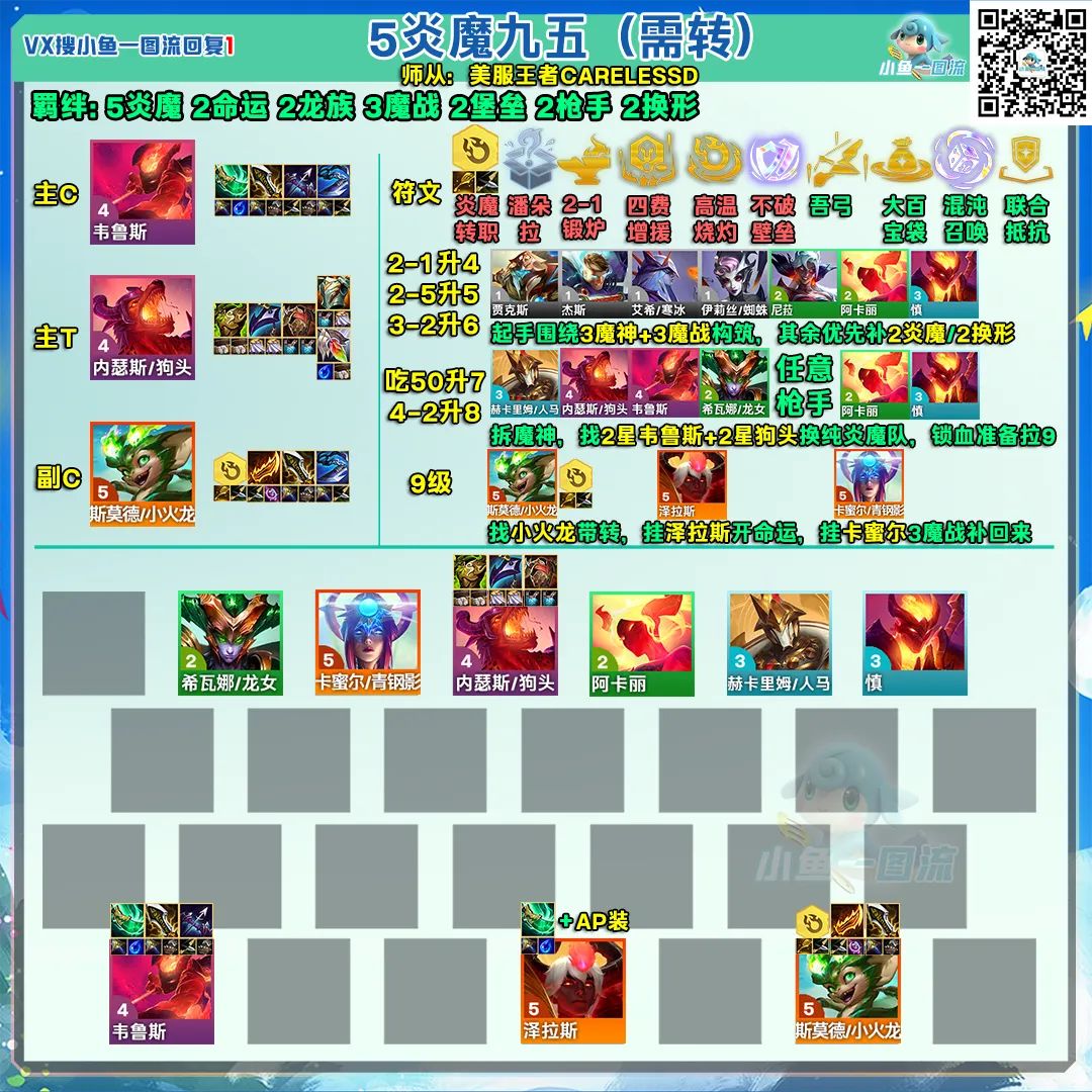 玩法逻辑:开局得连胜,并且装备偏青龙刀、轻语、无尽,在前两个符文刷完后,确定有一个炎魔转,才能选择此阵容,使用炎魔拼换形、枪手、堡垒,4-2升8级,大搜2星内瑟斯带肉装,2星韦鲁斯带输出装,挂件枪手带炎魔转+羊刀,锁血后升9级,找到泽拉斯+斯莫德,其中谁到2星谁带炎魔转,即为大成。 【阵容码】##5炎魔95需转-公众号小鱼一图流##【运营思路】@@@@@@@@H4sIAAAAAAAAA2WNURJ
