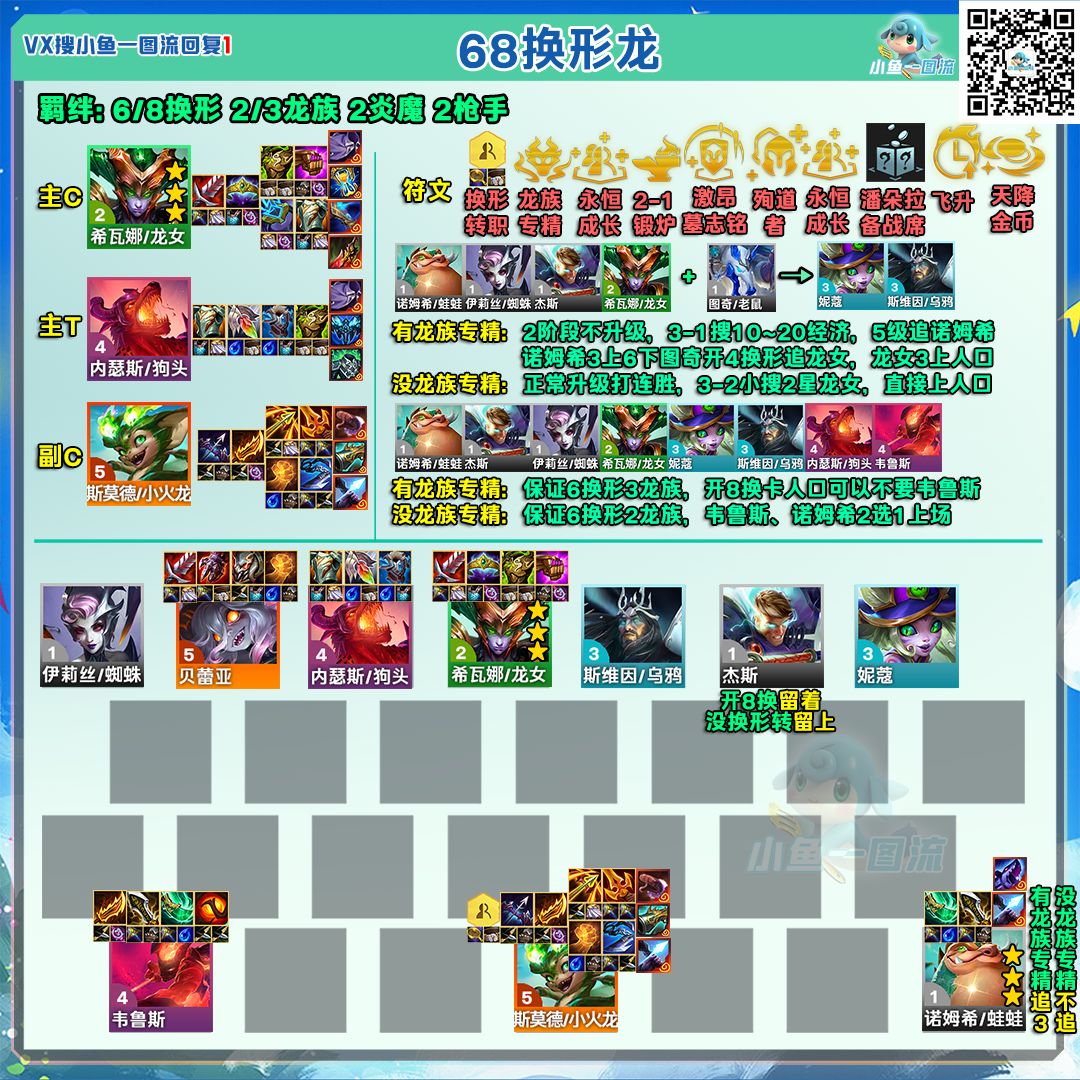代码失效看这 S六八换形龙(上分首推) 如果有龙族专精符文:最终人口先满足6换形3龙族,有换形转就开8换,没换形转杰斯就不要了留韦鲁斯 如果没龙族专精符文:最终人口先满足6换形2龙族,有换形转还是8换,韦鲁斯、诺姆希选1个上,没换形转就两个都留着 【阵容码】##68换型枪-公众号小鱼一图流##【运营思路】@@没龙族专精,正常连胜,3-2搜2星龙上人口;有龙族专精,2阶段不升,3-1搜10-20,5