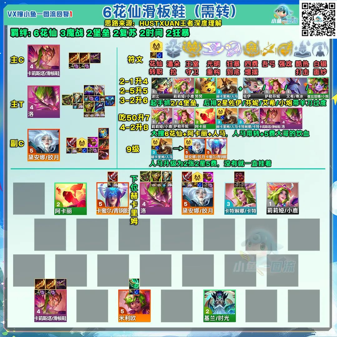 玩法逻辑:开局得连胜,并且有一把羊刀,最好花仙和堡垒牌偏多,在2个符文选完后,有花仙转就确定这套阵容,全力运营至4-2跳8大搜2星卡莉斯塔+2星洛,此时花仙转和饮血给到赫卡里姆,随后再冲击9级,把赫卡里姆的装备全扒了,换给黛安娜和青钢影,特别注意,花仙的特殊肉装还是得给洛。 【阵容码】##6花仙需转职-公众号小鱼一图流##【运营思路】@@@@@@@@H4sIAAAAAAAAA2VO2w0EQQhq