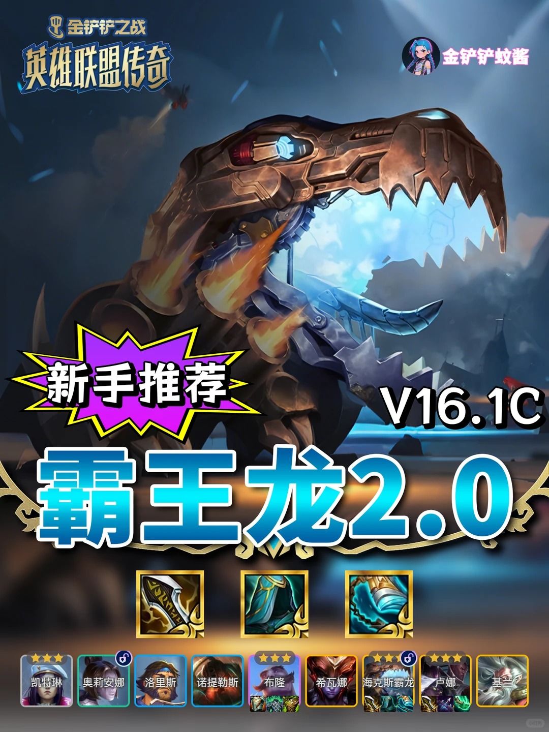 内容转自:金铲铲蚊酱 金铲铲S16最新16.1c新版本机甲霸王龙玩法升级了「霸王龙 2.0」无限技能炸屏,8人口成型无同行,把把吃分稳吃鸡,直接抄作业!✨女铲闭眼冲! ✅ 保姆级运营 开局不升级:2-3 前 D4 次解锁巴德,走优质连败拿刷新次数,优先做霸王龙装备 6 人口关键:D 出 2 星蔚 + 洛里斯 + 发条!重点追 3 星女警,有酸辣粉(萨勒芬妮)先凑 9 星皮城解锁霸王龙 6 人口稳血