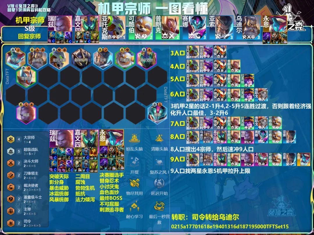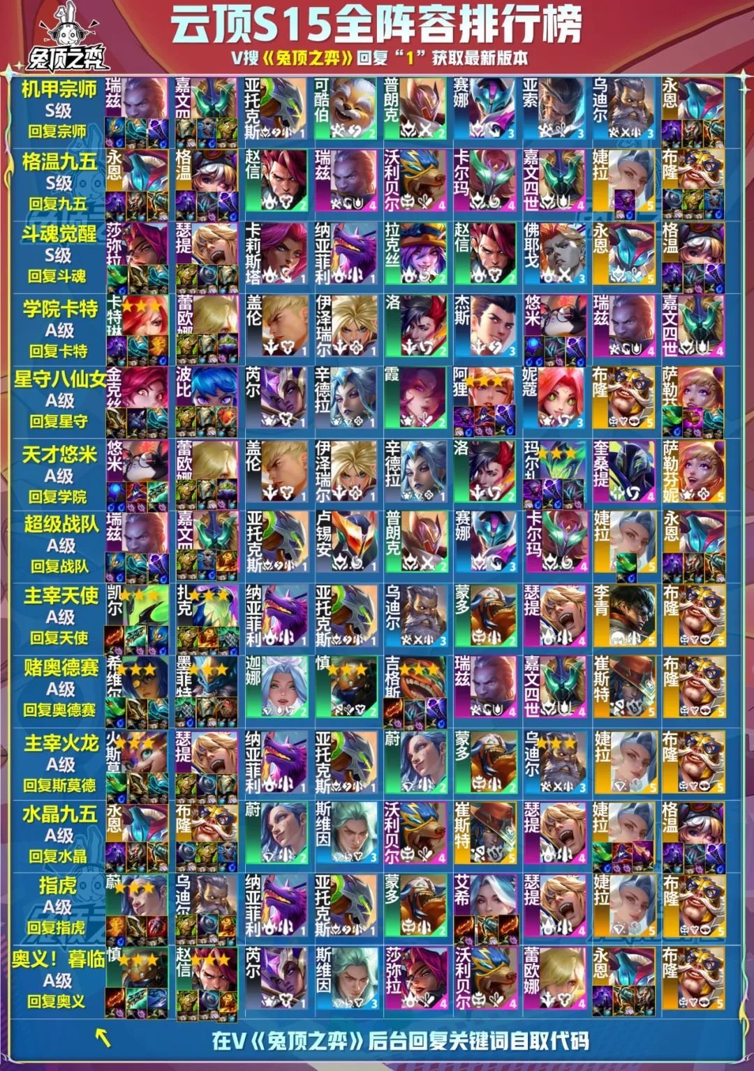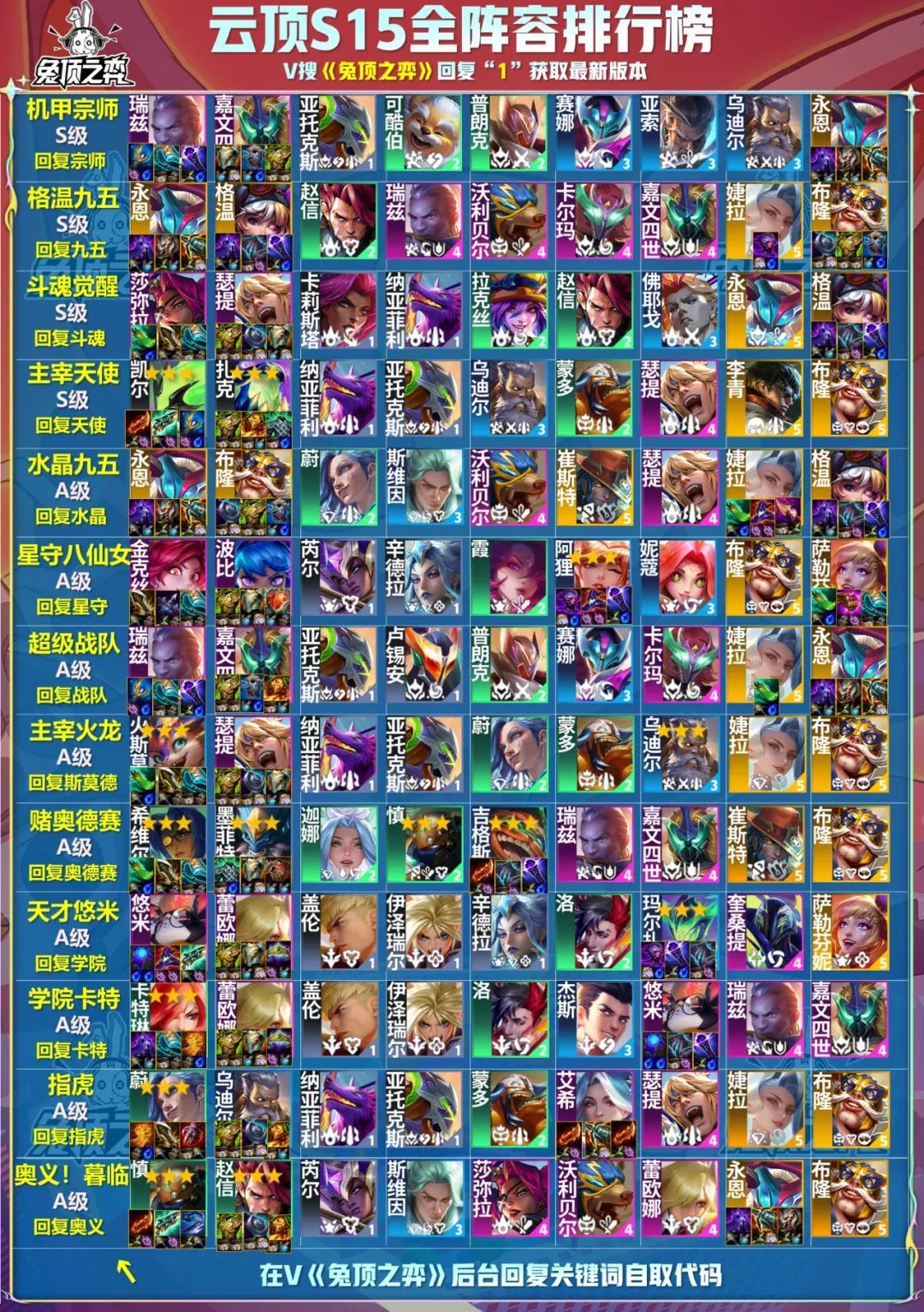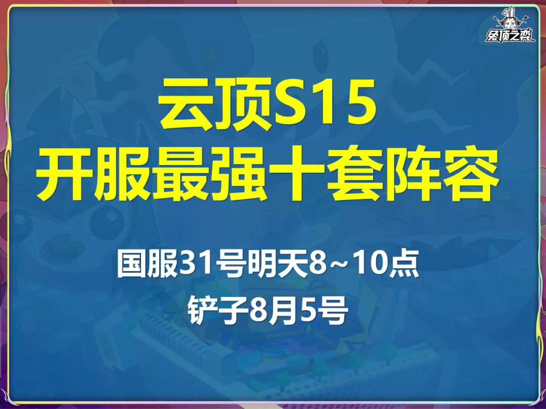 云顶S15开服了!外服已开,国服明天早上8点~10点,铲子预计8月5日开服,准备开冲!兔子肝了两天,把开服最强的一图全部做出来了,给兄弟们上好弹药,兔子也会在抖音、B站和公众号开直播打,不过兔子嗓子已经咳嗽2个周了,基本上说不出话了,听不到兔子声音。 目前开服榜一大哥,机甲宗师,测试服太跳的全部砍了,之前的A级阵容直接崛起了,瑞兹大哥撑起半边天,后期还有永恩的九五上限,7战队也很强,但是是下位替代