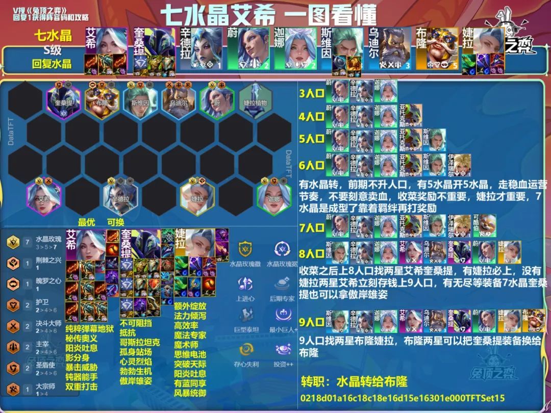 云顶阵容去兔顶之弈公众号 铲子S15开服的最强10套阵容!兔子已经帮大家整理好了。 定位赛轻松五连鸡。 版本最强阵容非水晶玫瑰莫属。7水晶刚需一个转职。170层、210层奖励都概率获得铲子。3、5水晶都是没有属性加成的。 收菜没有转就去玩这套维鲁斯九五。婕拉荆棘放第一排送死。给维鲁斯回蓝。婕拉技能可以复活荆棘增加全队攻速。攻速增加维鲁斯射箭数量。 喜欢赌狗的兄弟认准卡特准没错。独家三星早分就到手了
