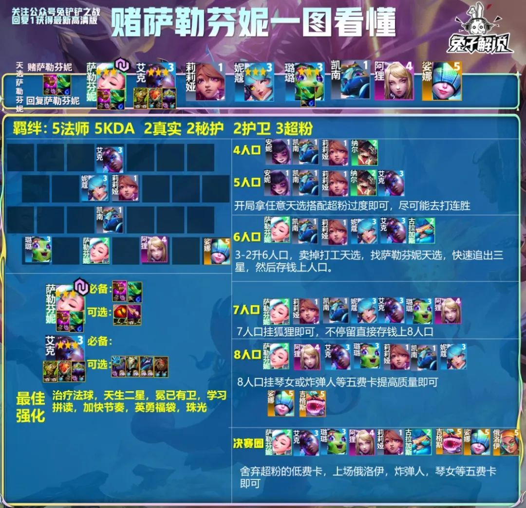 云顶阵容去兔顶之弈公众号 萨勒芬妮的索敌机制成为铲子特色 这次更新依旧没有修复,且这是铲子S10最后一次更新 开局不知道玩什么无脑卷萨勒芬妮准没错 一个天选就可以前六,萨勒芬妮三星就可以吃分 如果萨勒芬妮和艾克都三星,那就可以进决赛圈 阵容介绍 赌萨勒芬妮:5法师 5kda 2真实 2秘护 2护卫 3超粉 阵容核心: 6人口由萨勒芬妮,妮蔻,莉莉娅,凯南,艾克,璐璐组成阵容。找到萨勒芬妮天选,快速