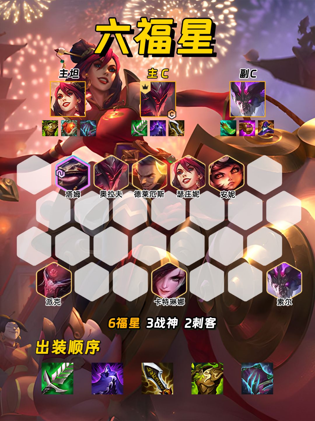 福星真的是太好玩辣 还不会的兄弟姐妹赶紧码住! ✨过渡思路✨ 2-1有三福星直接冲🧨 直接走8连败到3-5阶段🙆 2-3或2-5才开出三福星🧧 可吃4-6连败到4阶段左右👌 然后大D找奥拉夫、龙王、男刀等强势卡 同时提升基础牌的质量完成收菜🥬 开出三福后保持连败是个难点❗ 可通过不升级、少上棋子、不升二星、不上装备等方式 同时一定要多观察对手站位和质量🛡️ 有同行可只留安妮和塔姆一路连败❌ 收菜血