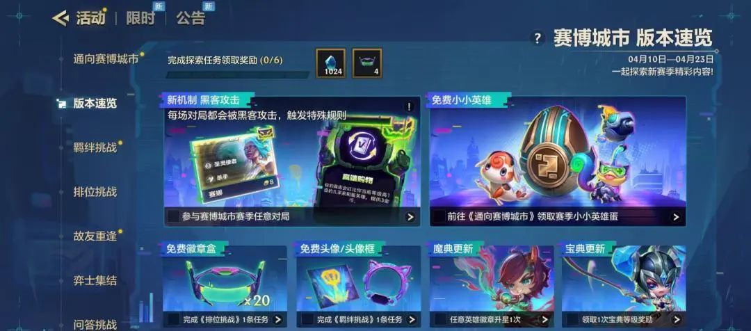 弈士们: 【赛博城市】全新赛季开启,一起来探索新赛季各模块精彩内容吧!完成探索还有【赛博城市 徽章盒】等好礼! 今天金宝儿就为大家整理了一份活动攻略!教你新赛季拿下55个徽章盒! 各位弈士请跟随着金宝儿的脚步一起看看吧! 【版本速览】 完成任务,4个徽章盒免费领! 活动入口 游戏主页面--事件--活动--版本速览 活动时间 2025年4月10日--2025年4月23日 (详情请以游戏内为准) 【羁