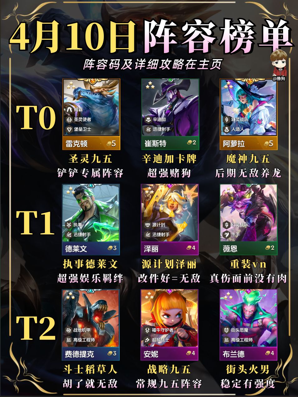 公众号爱下棋的撸狗有全部阵容攻略及代码,每日更新阵容榜单,下棋攻略