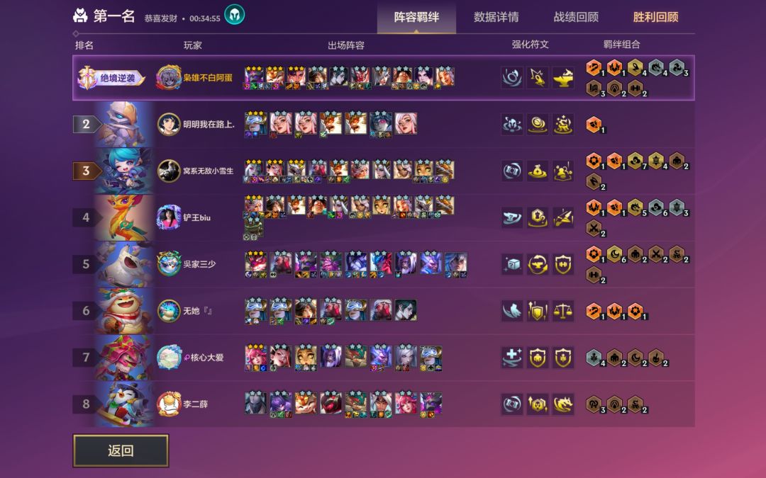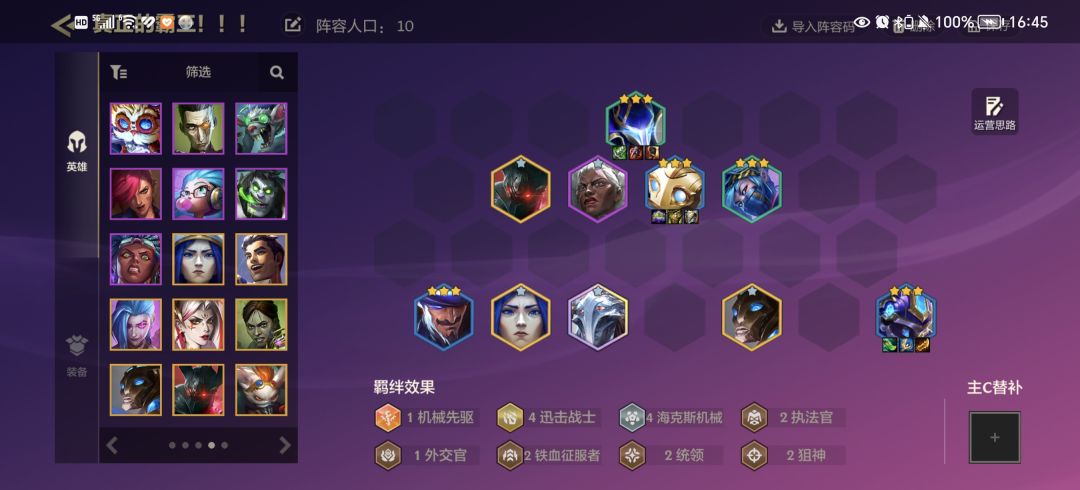 玩了三把,两把第一,一把第二(被三星五费腐乳了)。总结强度是很有的,基本魔腾二星带装备就能库库连胜到5阶段(如果前期稳血好,这基本就有分了),七人口四迅击四海克斯就基本完全体,羁绊和D牌很契合。注意就是魔腾单顶触发霸王,装备如果是血手要先卸了,触发霸王再装上不然两个阈值一样会同时触发(都是60%)。然后想吃鸡除了刚需魔腾三星(这不废话)后排大嘴和卡牌也得三一个,不然后期输出不够,而且机器人最好也要