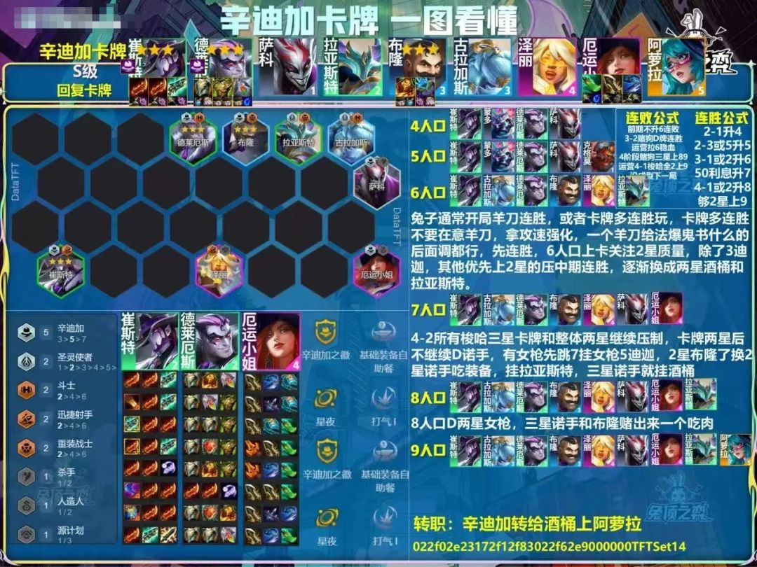 阵容构成:6人口:大嘴、蝎子、卡牌、诺手、布隆、酒桶组成拼多多羁绊大嘴和蝎子追不了三星就换凯隐和高费迅捷射手。白嫖女枪开5辛迪加。在6人口追卡牌的三星。卡牌三星后上人口。 7人口:观察布隆和诺手的数量,数量对就在7人口追诺手和布隆的三星。这套阵容想要吃大分,两个前排三星很关键。不多就上8人口开出完美羁绊。 8人口:一直D所有低费三星,女枪多也可以拿来追三,女枪冷门卡很容易追三。 辛迪加帽子给谁?卡