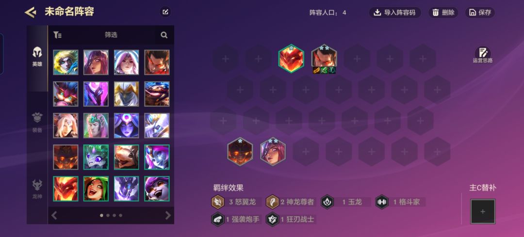 T0阵容成型必上分前排主C狗熊后排主艾尼维亚,如果来牌好的话龙神拿胜利之路,不好的话拿稳定之路。 1.前期可以先用瑟提过度上3怒翼龙装备优先拿合成羊刀、水银、饮血剑的散件。 2.中期等级升到7级小滴一波尽量把狗熊升到二星装备换上装备,基本上能稳住血。 3.后期升到8级滴出三星狗熊开出6神龙3传奇半神,前面狗熊链接李青(李青装备给狂徒、反甲、龙牙),奥恩(多余的坦装给奥恩)链接瑟提,艾妮欧亚(装备青