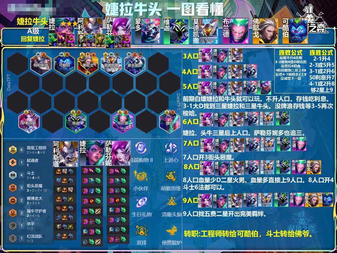 阵容核心:5人口由婕拉、萨勒芬妮、牛头、蒙多+任意街头恶魔弈子组成羁绊。在5人口追这四个一费的三星。婕拉和牛头是关键。婕拉牛头三星后开始上人口。8人口血量少D二星火男稳血,血量多直接上9人口找五费二星吃鸡。 装备方面:主C婕拉:青龙刀、纳什、法爆最佳。没有纳什可以给破防或者红buff等启动装。副C萨勒芬妮/火男:青龙刀、鬼书、法爆。给三星萨勒芬妮,后面火男二星给火男。主T牛头:板甲、离子、狂徒最佳
