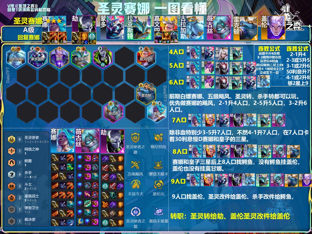 推荐原因1:二费赌狗很适合当前版本节奏2:vn二费卡数量众多可以轻松追三,而我们拿了二星赛娜和皇子对手就很难三星。3:铲子特有的5阶段重装选秀,拿到重装转很大提升。 阵容核心6人口:vn、凯隐、皇子、赛娜、塞拉斯、日女开出4重装3幻灵2杀手羁绊。因为日女是四费卡没有用蝎子替代。在6人口追vn的三星,蝎子和凯隐同为二费卡谁三星谁吃肉装,vn三了前排差的多就上人口找二星日女当前排。8人口:没有重装转只