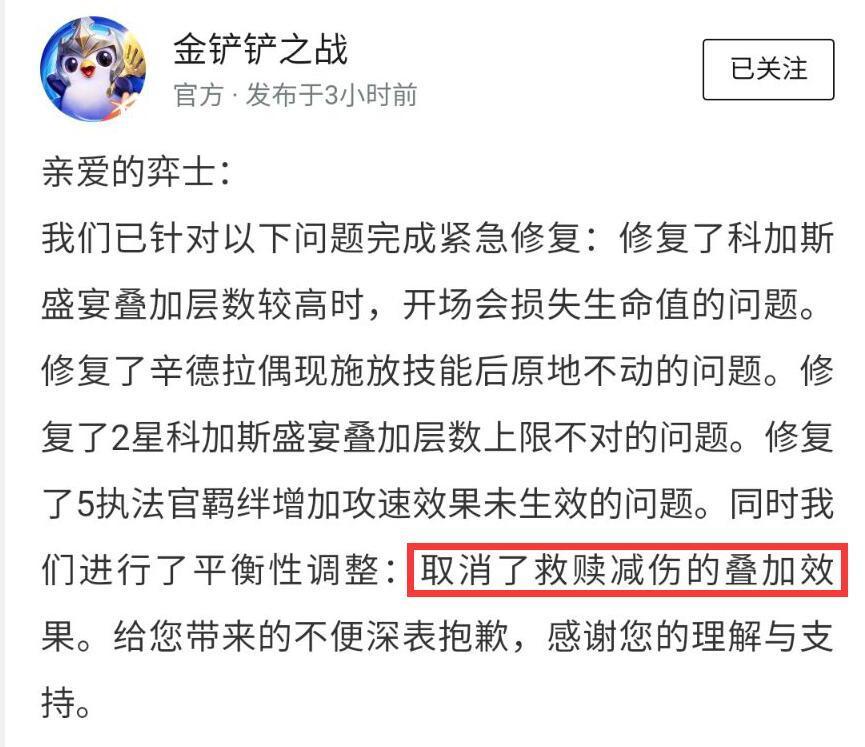 最近一段时间,很多金铲铲论坛、贴吧都在讨论什么阵容可以压制“救赎璐璐”,因为玩的人太多,几乎每一局都有几家,不玩克制阵容根本就没法打。毕竟,很多热门阵容都是法术输出,而4白魔璐璐搭配3件救赎后,让很多法术输出阵容都打不动。 5月13日,金铲铲之战进行了平衡性调整,取消了救赎减伤的叠加效果,这也就意味着3救赎璐璐彻底跌落神坛,可谓大快人心。不过,“救赎”被削弱后,受影响的是“铁王八仙女”阵容,对于白