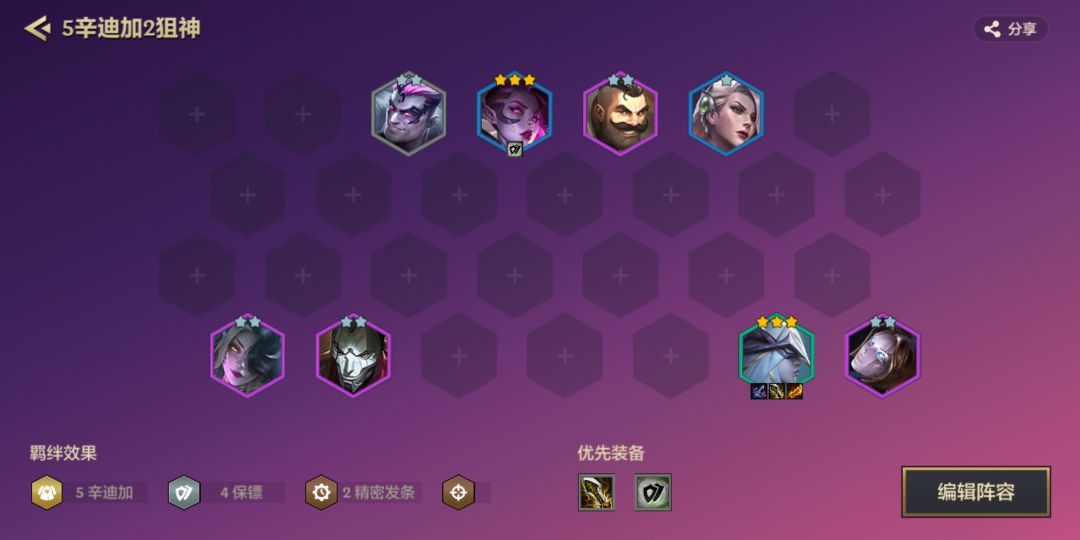 开局抢眼泪 4人口两保镖两狙神 4金币拉5人口 12金币拉6人口 6人口 婕拉给狙神转和蓝BUFF 卡着5利息 D出3星婕拉和3星寒冰 如果脸黑婕拉两星也行 寒冰必须3星 婕拉必要蓝 不然启动太慢 就是要开局就放技能把对面后排打残 然后电刀寒冰收割 7人口阵容成型 5辛迪加4狙神 如果要打打后期 可以上人口加上烬和泽丽组成6狙神 板甲莫甘娜站在前面 一个人可以顶半天 保镖往后站 保护射手不背刺客切