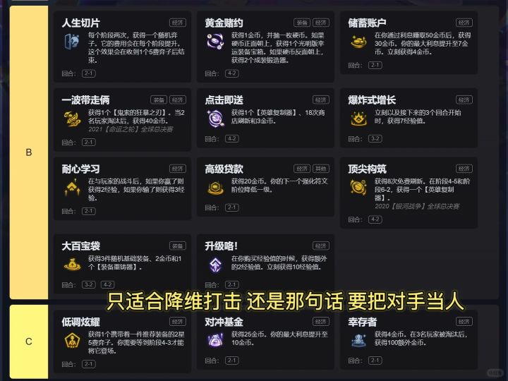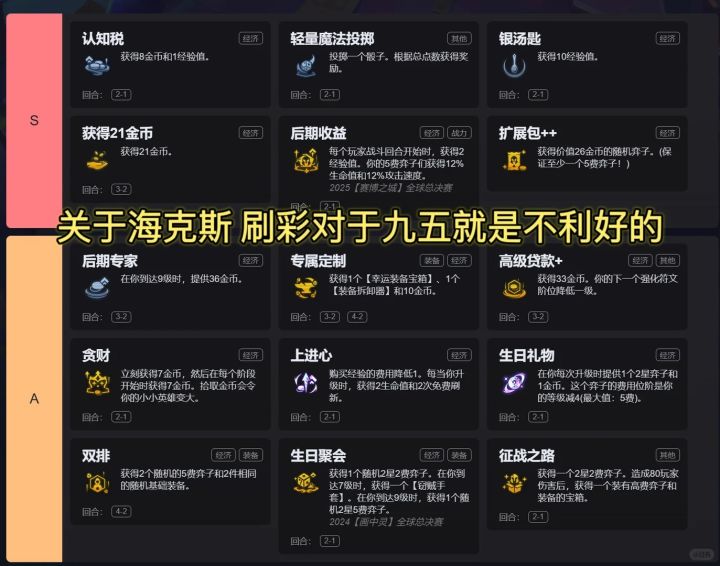 内容转自:云顶小猪今天给大家详细分享一下当前版本吃鸡率最高的九五玩法,为了这篇攻略也是准备了足足两天时间,从过渡到海克斯到后期搭配思路,阵容上限,装备合成,整体优先级,星神逻辑陷阱 等多方面 来谈谈我的理解。技术总结:1、不要老想着上限,九五是以过渡为核心的,拿经济海克斯也要分即时到账和预期类的,比如幸存者,我永远不推荐这个海克斯,除非你王者打白金这种降为打击。2、星神是让你过渡舒服的,不