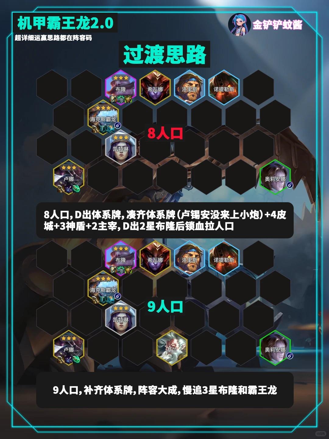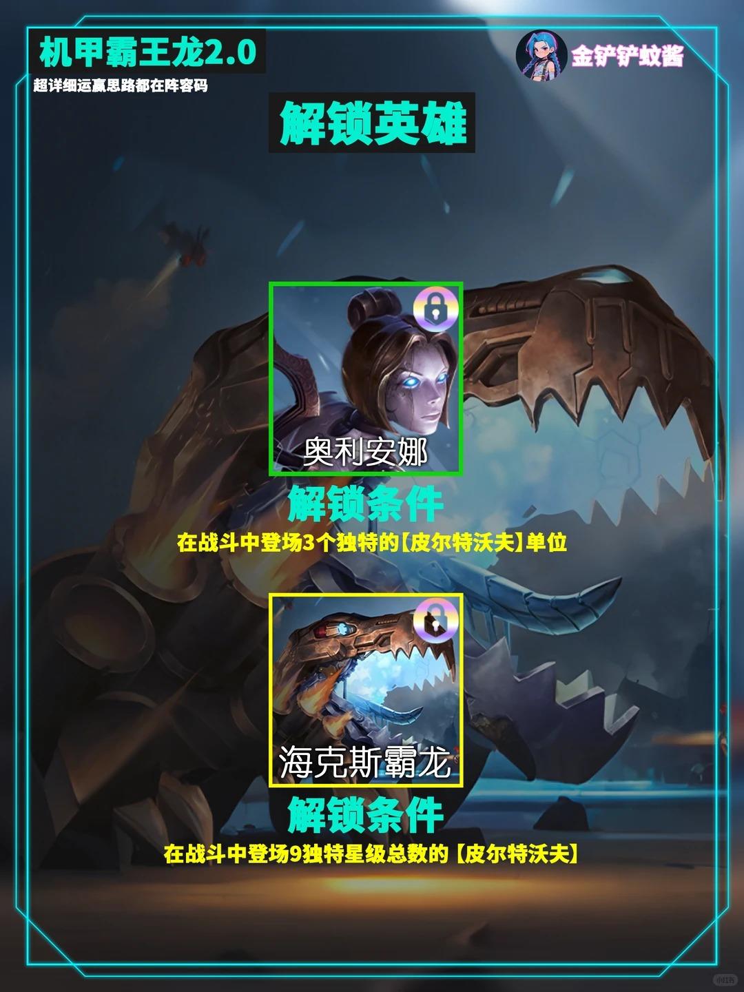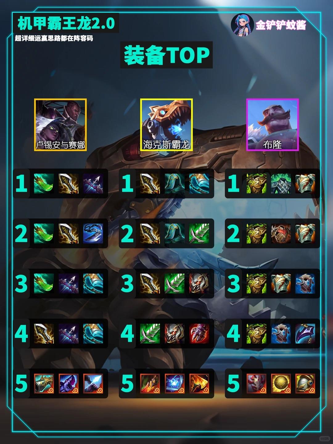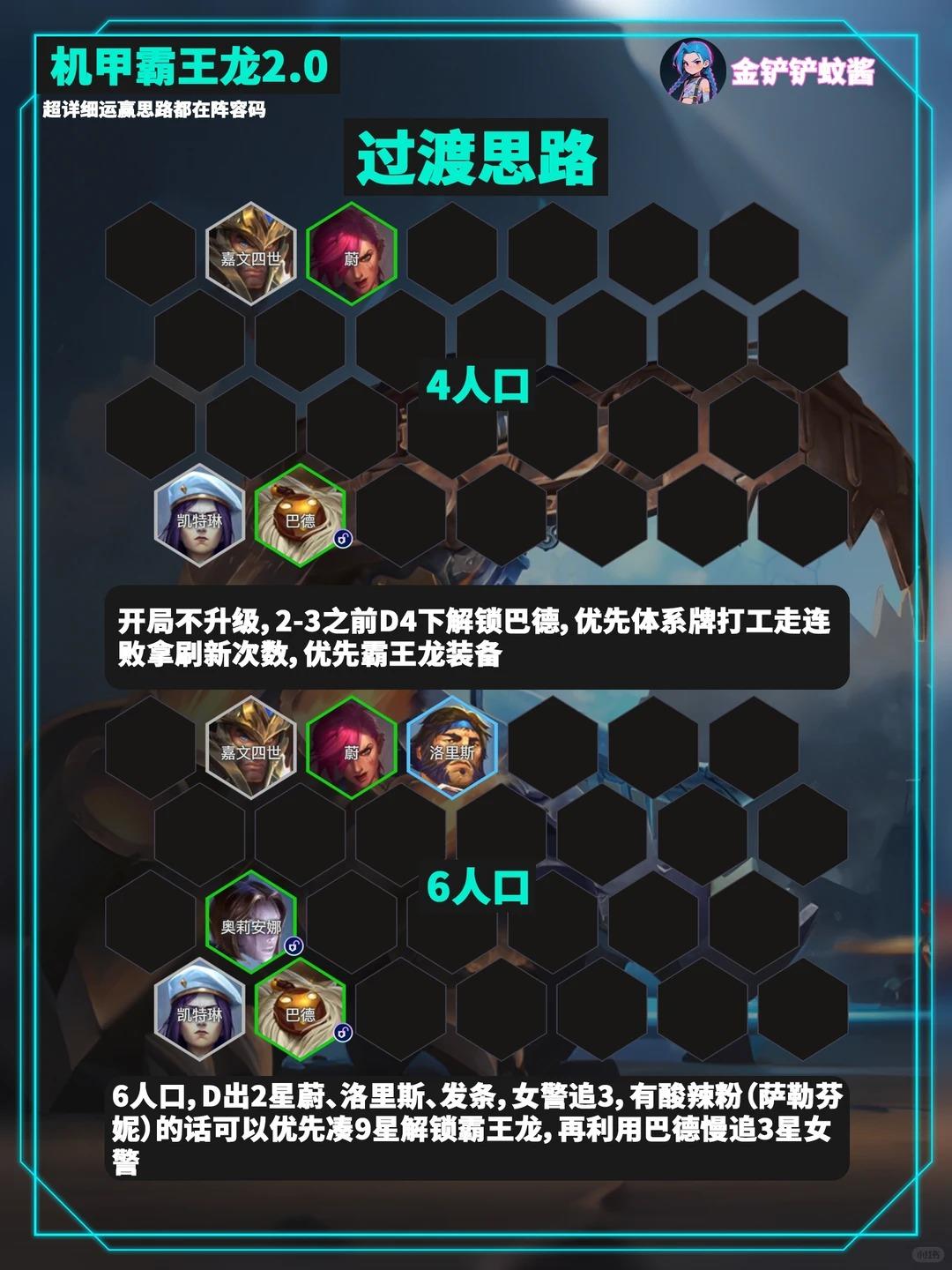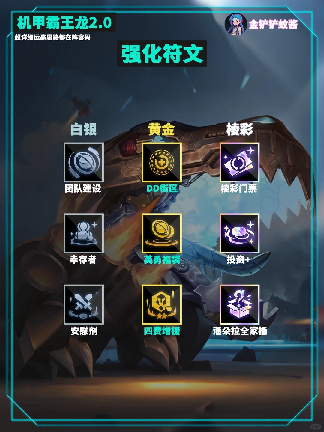内容转自:金铲铲蚊酱金铲铲S16最新16.1c新版本机甲霸王龙玩法升级了「霸王龙 2.0」无限技能炸屏,8人口成型无同行,把把吃分稳吃鸡,直接抄作业!✨女铲闭眼冲!✅ 保姆级运营开局不升级:2-3 前 D4 次解锁巴德,走优质连败拿刷新次数,优先做霸王龙装备6 人口关键:D 出 2 星蔚 + 洛里斯 + 发条!重点追 3 星女警,有酸辣粉(萨勒芬妮)先凑 9 星皮城解锁霸王龙6 人口稳血