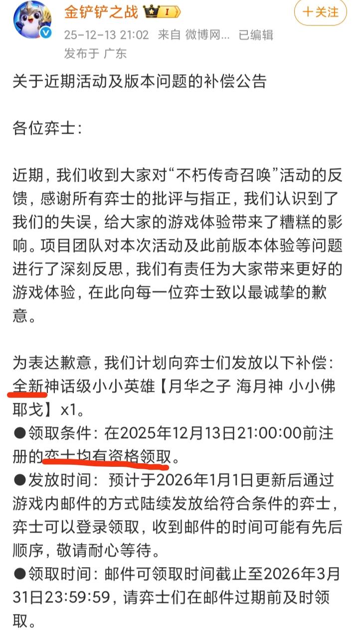 前情提要:《金铲铲之战》“不朽传奇召唤” 活动因规则设计失误引发玩家广泛讨论,471名玩家意外以60元低价抽中原价数千元的至臻道具,官方公告确认不会回收该类道具,这一处理方式引发不少玩家争议。为平息风波,游戏项目团队于近日发布公告,就活动失误及此前版本体验问题向全体玩家致歉,并推出重磅补偿:全新未上架的限定神话级小小英雄【月华之子 海月神 小小佛耶戈】。此次补偿领取资格宽松,2025年12月