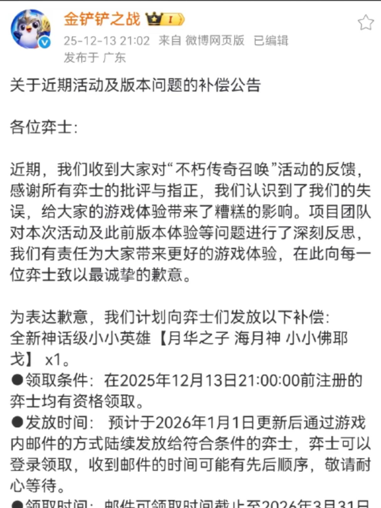前情提要:《金铲铲之战》“不朽传奇召唤” 活动因规则设计失误引发玩家广泛讨论,471名玩家意外以60元低价抽中原价数千元的至臻道具,官方公告确认不会回收该类道具,这一处理方式引发不少玩家争议。为平息风波,游戏项目团队于近日发布公告,就活动失误及此前版本体验问题向全体玩家致歉,并推出重磅补偿:全新未上架的限定神话级小小英雄【月华之子 海月神 小小佛耶戈】。此次补偿领取资格宽松,2025年12月