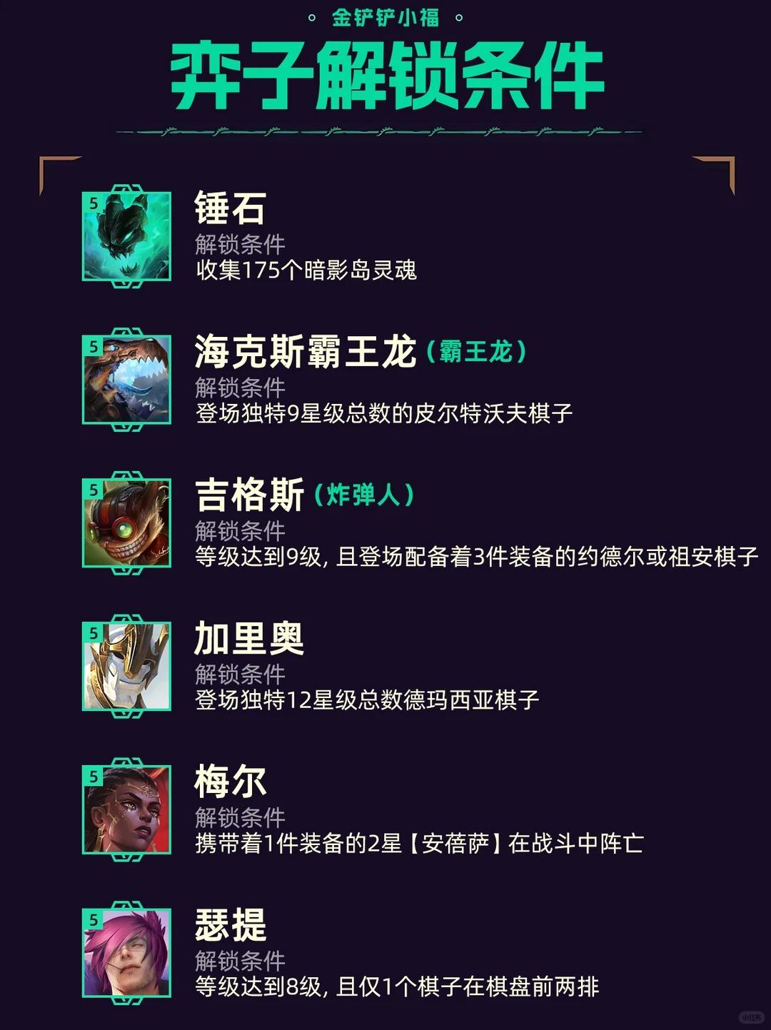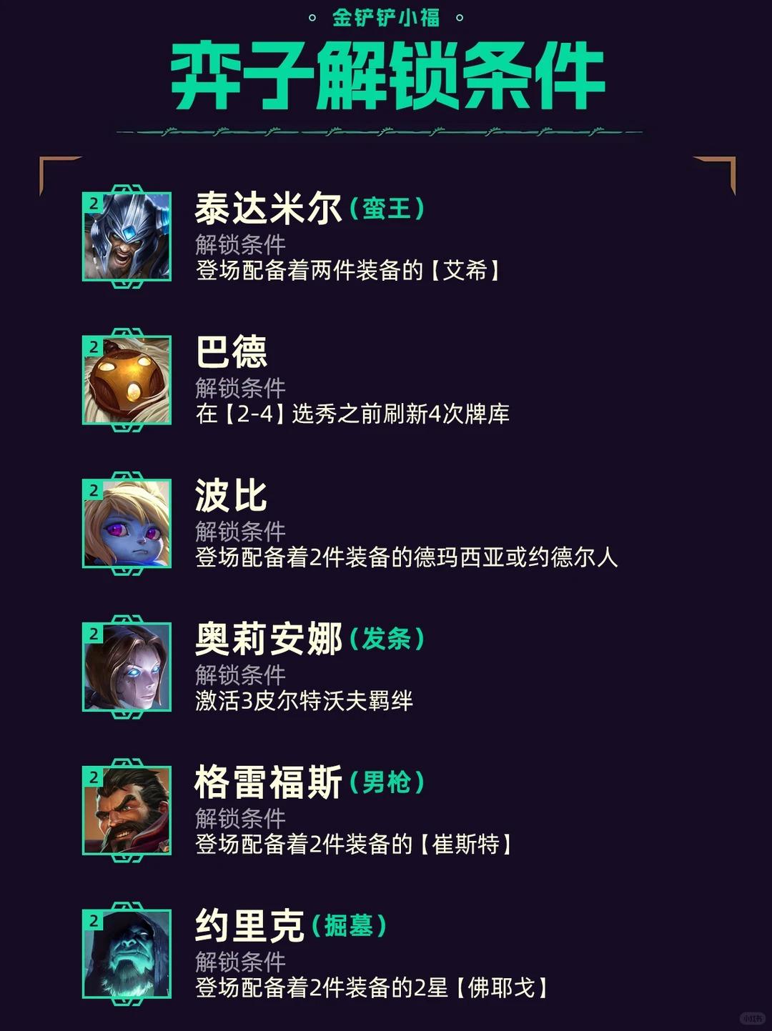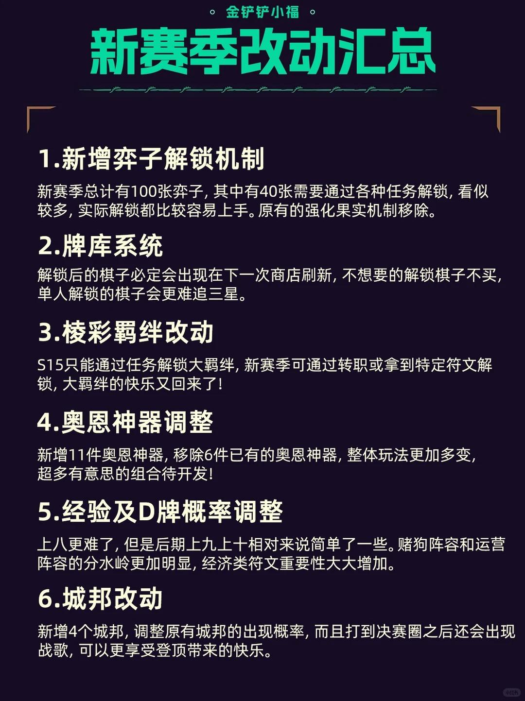 1.新增弈子解锁机制新赛季总计有100张弈子,其中有40张需要通过各种任务解锁,看似较多,实际解锁都比较容易上手。原有的强化果实机制移除。2.牌库系统解锁后的棋子必定会出现在下一次商店刷新,不想要的解锁棋子不买,单人解锁的棋子会更难追三星。3.棱彩羁绊改动S15只能通过任务解锁大羁绊,新赛季可通过转职或拿到特定符文解锁,大羁绊的快乐又回来了!4.奥恩神器调整新增11件奥恩神器,移除6